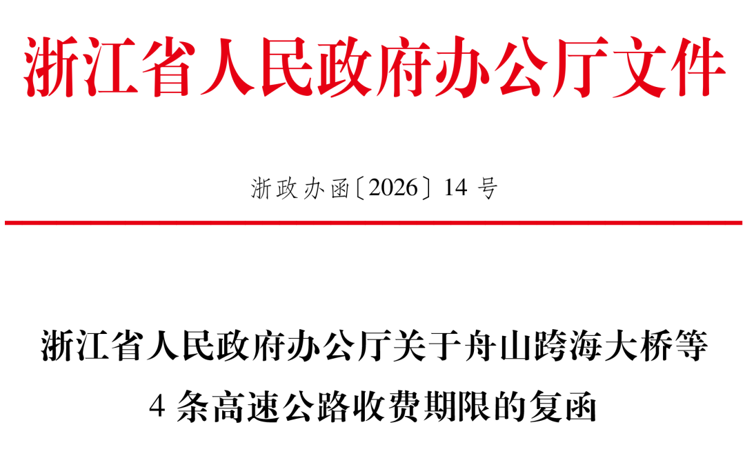 近日,浙江省政府办公厅针对《宁波市人民政府关于提前取消宁波市高速公路江北连接线收费项目并停止合并收费的请示》《浙江省交通投资集团有限公司关于核定舟山跨海大桥等高速公路收费期限的请示》进行复函↓↓