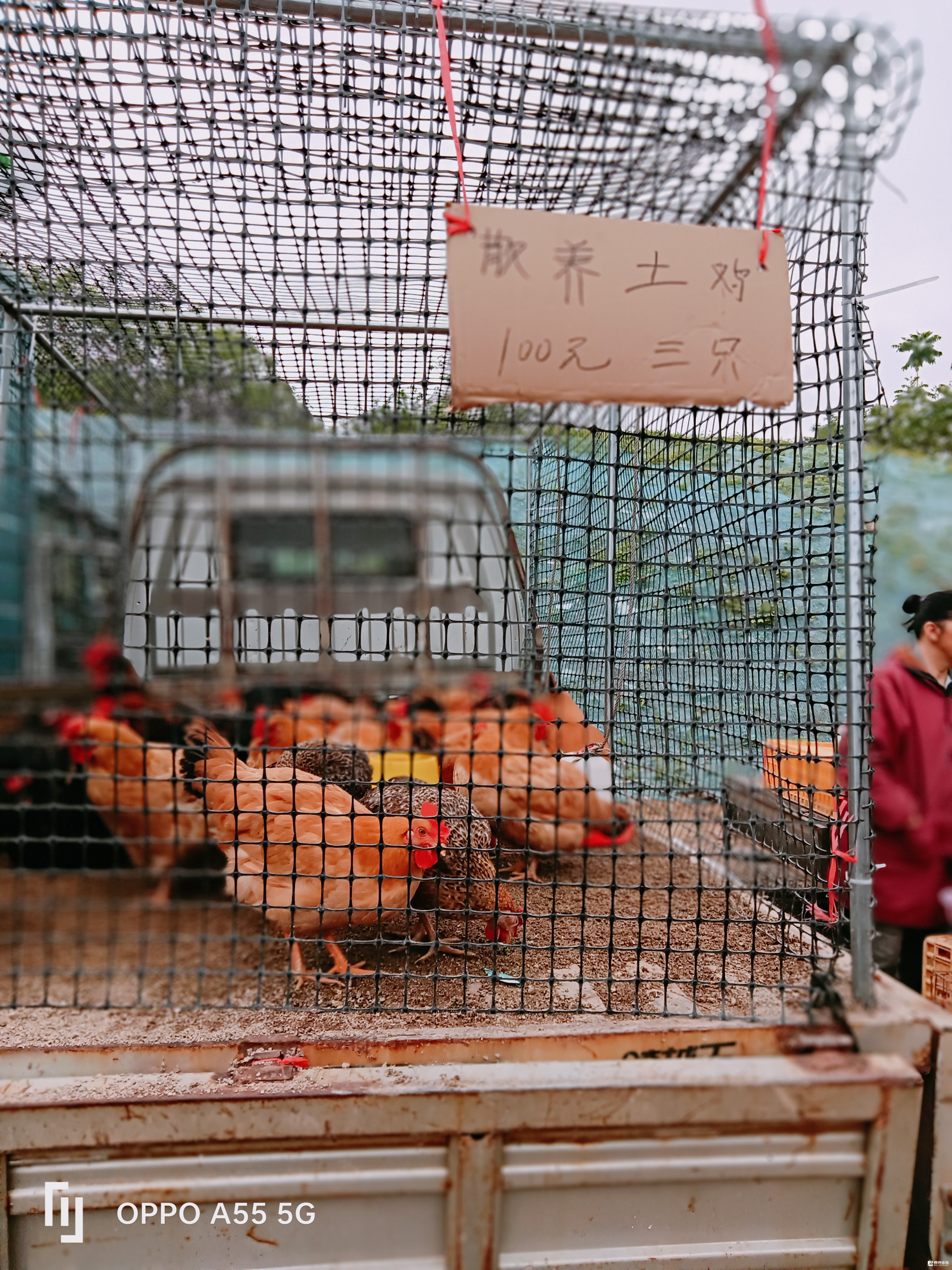乡市集,每集车水马龙,人挤人,是什么有这么大的吸引力,那就是价廉实惠的东西多。散养土鸡,明码标价,三斤左右一只,一百元三只,活蹦乱跳,货真价廉(钢丝网上挂了纸牌广告),你怎么看。