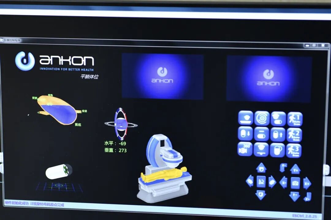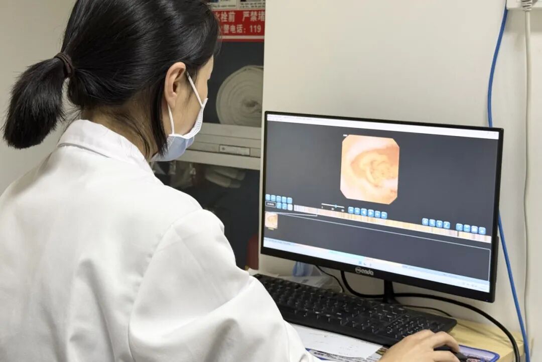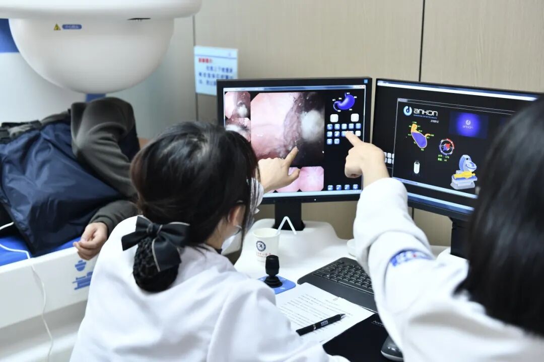 吞下胶囊内镜后,由消化内科主治医师杨姣姣和周苗苗共同配合操作。杨姣姣负责在电脑前实时观察胶囊在体内的位置和拍摄到的图像,而周苗苗则手持一个外部控制磁铁,像“遥控器”一样引导胶囊的方向。