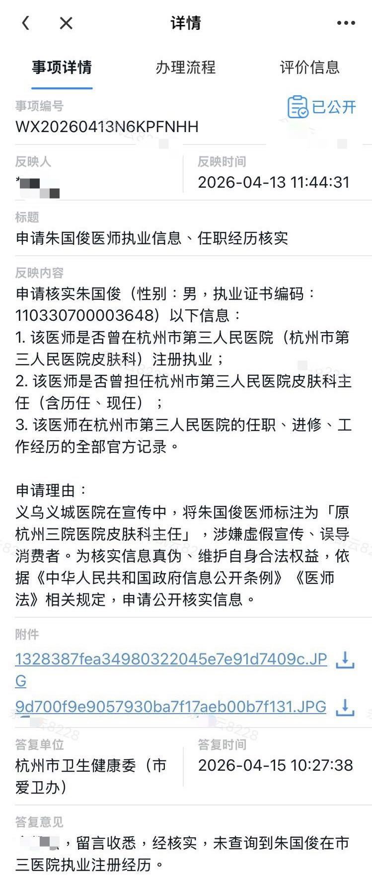 一、违法事实涉事医疗机构(**医院)对外宣传其医务人员具备原杭州市第三人民医院皮肤科任职履历,经向杭州市卫健委核实确认(民呼我为事项编号:WX20260413N6KPFNHH),该医生无在该院执业注册经历。医疗机构主观存在故意,虚构、伪造医师从业资质履历进行商业宣传,误导消费者作出就医选择。本人基于其虚假宣传的医师资历产生就医信赖,前往该院就诊,并支付医疗费用?元,其行为已侵害消费者合法权益。