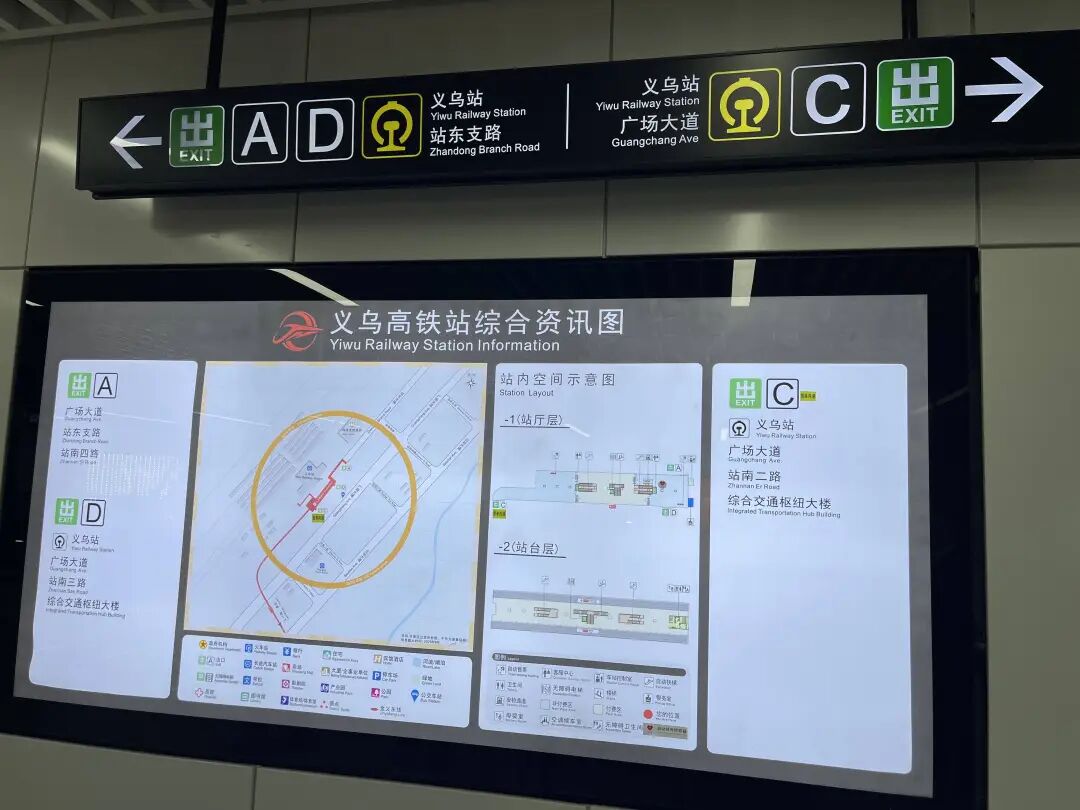 其中,D出入口是通往铁路义乌站的最优选择,右拐即可看到公交车站,步行三四分钟,上至二楼便能直达铁路义乌站进站口,全程无需绕路,携带行李也能轻松通行。