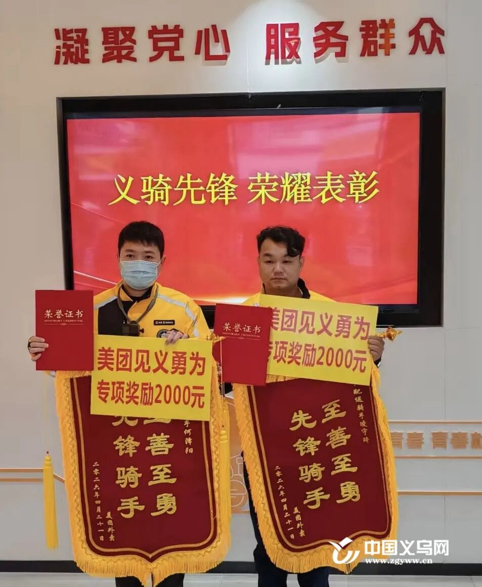 4月21日,为表彰凌宇琦、何泽阳的见义勇为行为,美团总部工作人员专程从杭州赶赴义乌,在义驾山骑手之家,为两人正式颁发“先锋骑手”荣誉奖章、锦旗及现金2000元奖励,以此弘扬这份凡人善举,传递正能量。与此同时,江东街道东大门社区也将他的事迹向有关部门进行了申报,让这份见义勇为的精神被更多人看见、被更多人传承。