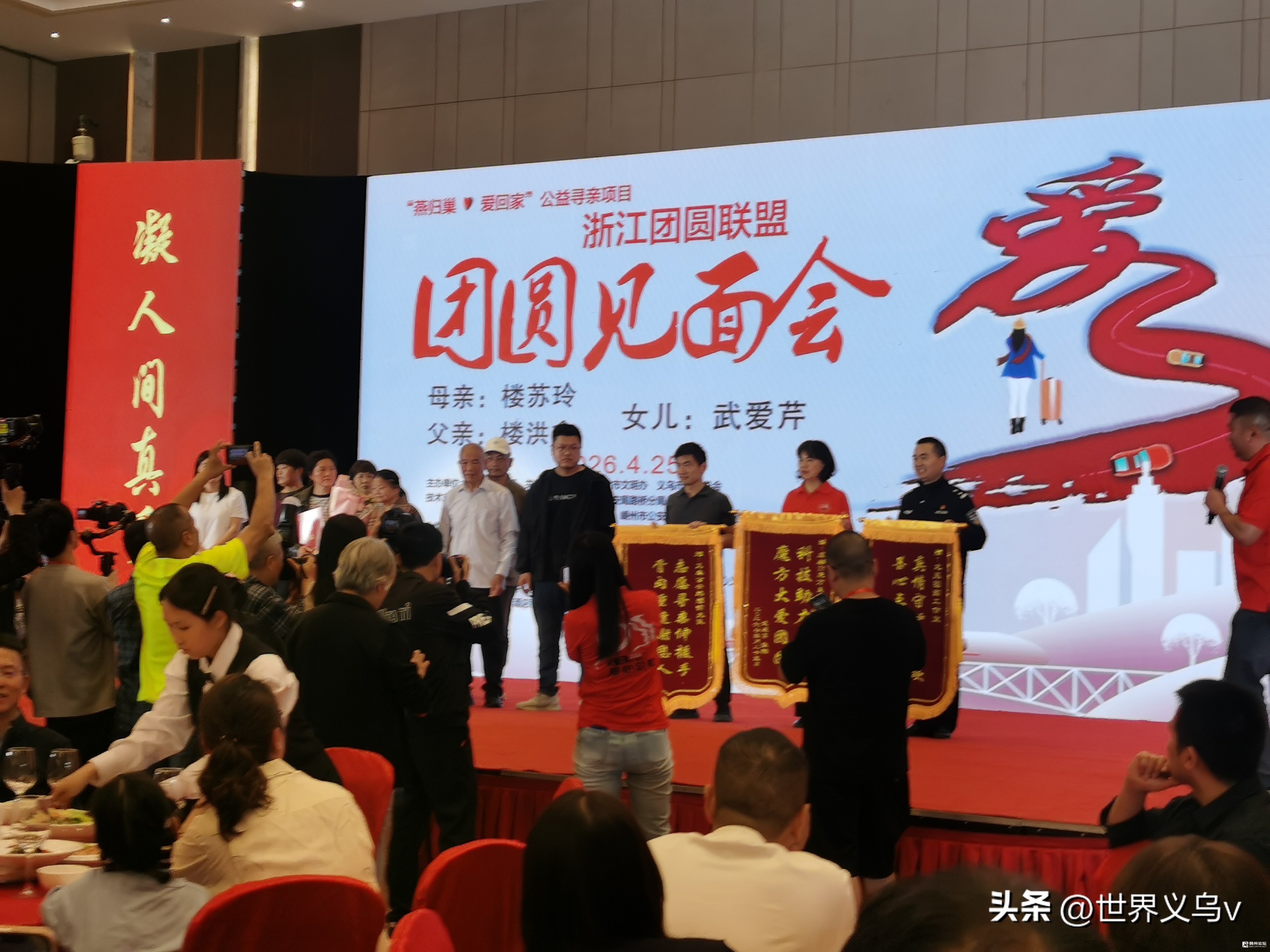答谢会特别设置了“团圆见面会”环节,成为全场最动人的一幕。在“老亮”警官和程青梅的主持下,几对离散多年的家庭在现场重逢。来自河北的女儿武爱芹与义乌父母紧紧相拥,来自河南的女儿张海芳与义乌父母泪流满面。这一环节生动展示了爱心公社“燕归巢 爱回家”公益寻亲项目的成果——截至2026年初,该项目已成功帮助600多个家庭团圆。