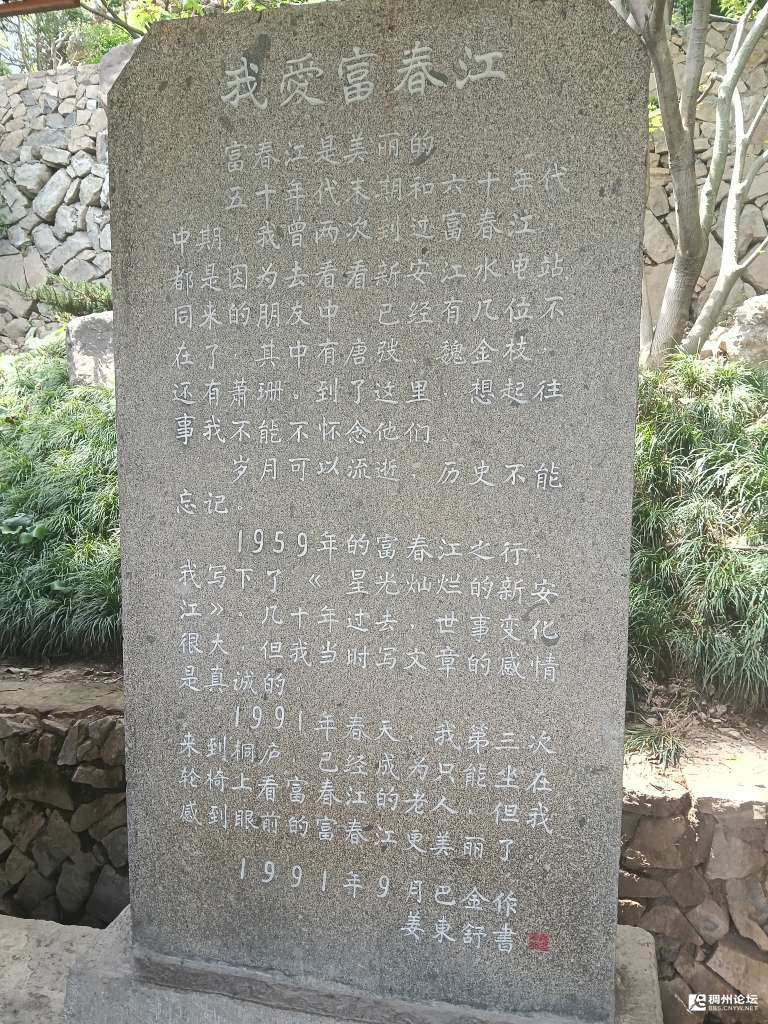 尤其动人的是两块现代的石碑。一块是巴金的《我爱富春江》碑记,文字很质朴且深情,没用什么漂亮词句,却充满着对富春江说不尽的眷恋与热爱,字里行间,满是对自然之美的由衷赞叹。
