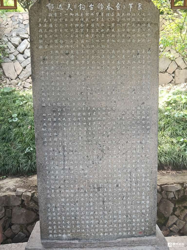 另一块是郁达夫的,用钢笔字录着他的《钓台的春昼》,清瘦的字迹,文风洒脱而自然,将春日钓台的清寂幽美与文人的心境凝于石上,仿佛还带着那个百年前春日的游踪与感怀,在我们几个游人面前,仍感到无比的鲜活与优美。