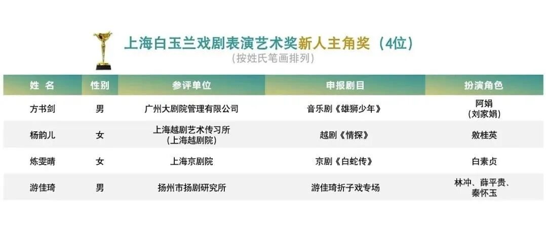 评委会评价,方书剑将主角阿娟从懦弱到自强的成长蜕变演绎得层次清晰,精准展现出少年突破困境、自我和解的精神成长,其诠释的生命韧劲完美契合奖项专业评判理念。白玉兰新人主角奖,主要针对的是30周岁以下的优秀青年演员,国内外演员都可以参评。