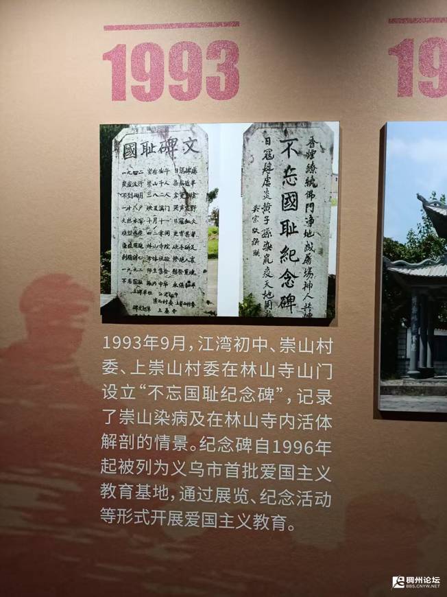 为了警示后人,1993年9月,江湾初中和崇山村联合出资在林山寺广场上设立了一块“不忘国耻纪念碑”,碑上记录了崇山鼠疫及日军在林山寺内实施活体解剖的惨痛史实。该纪念碑于1996年被义乌市委命名为义乌市首批爱国主义教育基地。历经30年沧桑,林山寺不忘国耻纪念碑已成为民族记忆的一部分。