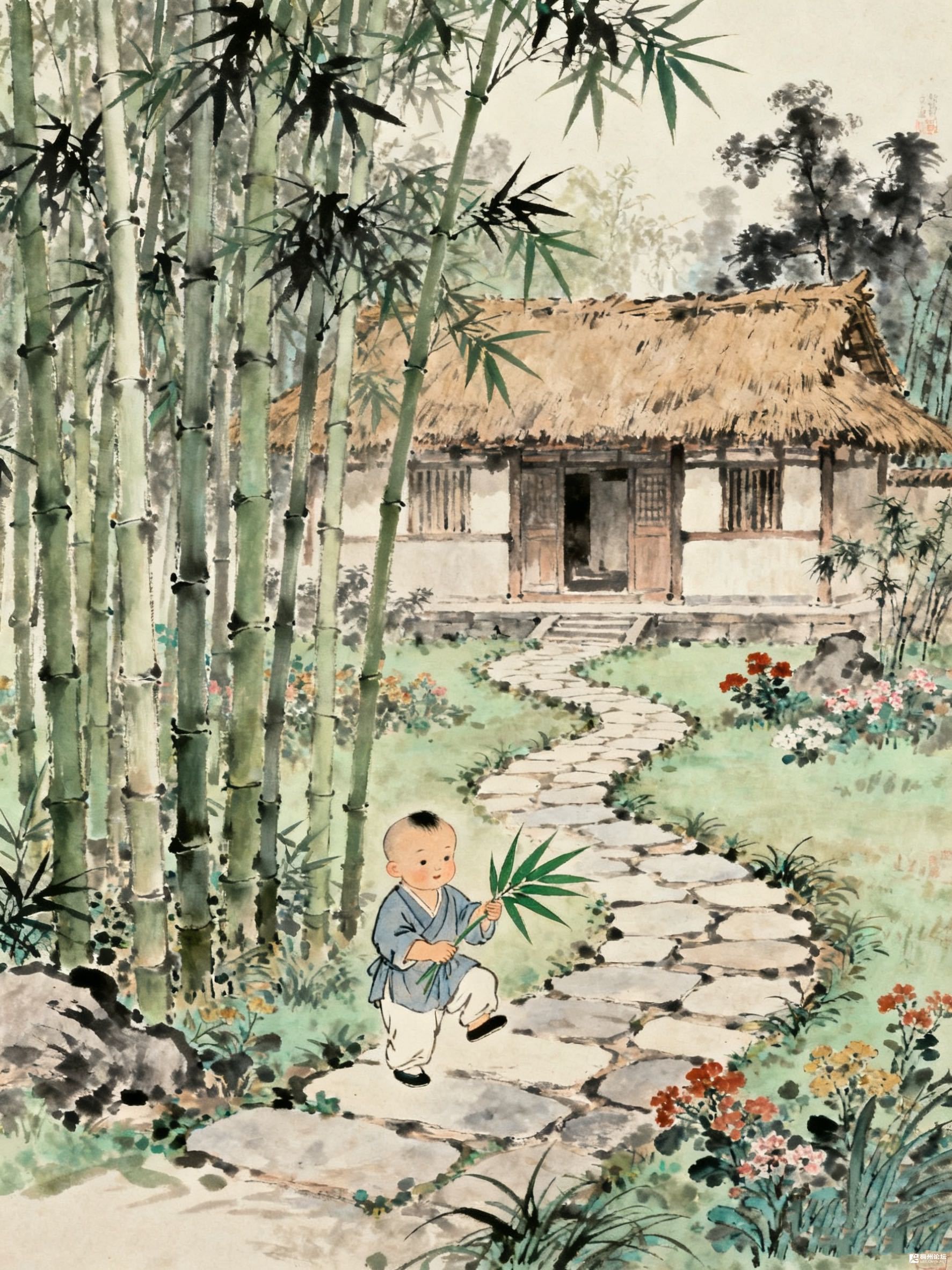 修竹密密麻麻,绿得能滴出水,把小径衬得愈发清幽 光脑袋的小娃穿着蓝褂白裤,手里攥着片竹叶,踮着脚走在石板路上,小眼睛东瞧西看,像在找竹丛里的小秘密。远处的茅草屋矮矮的,柴门半掩,石板路弯弯曲曲,把花香和竹影都引到了屋前。