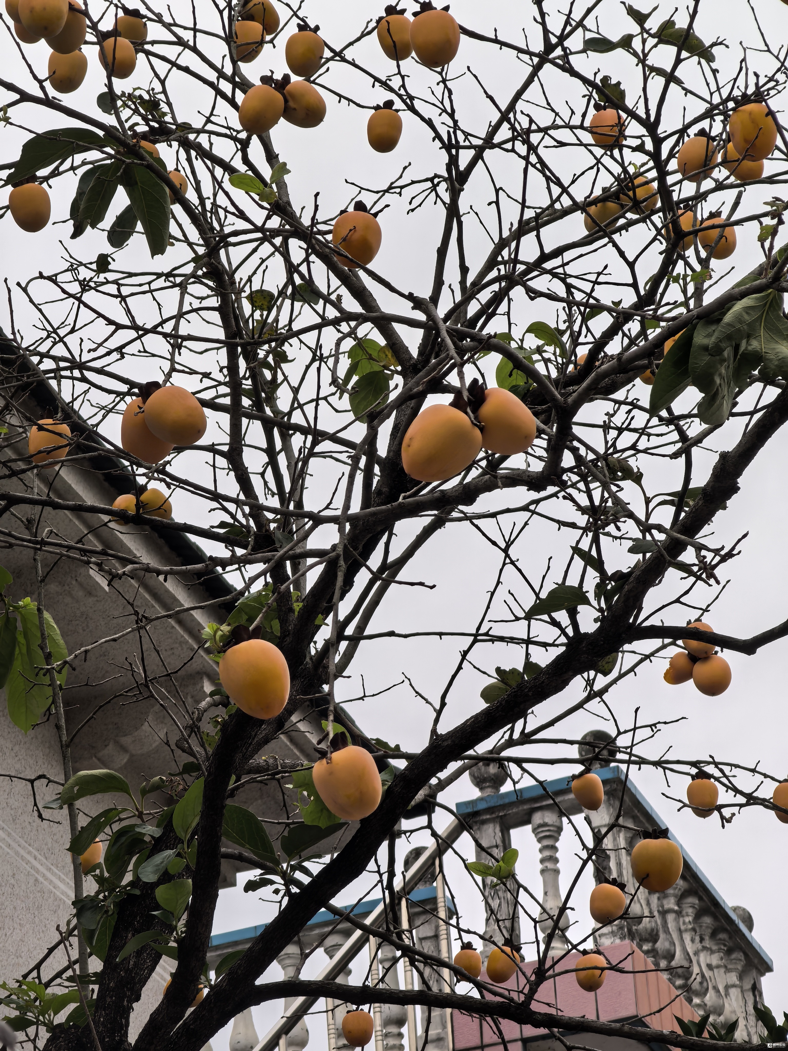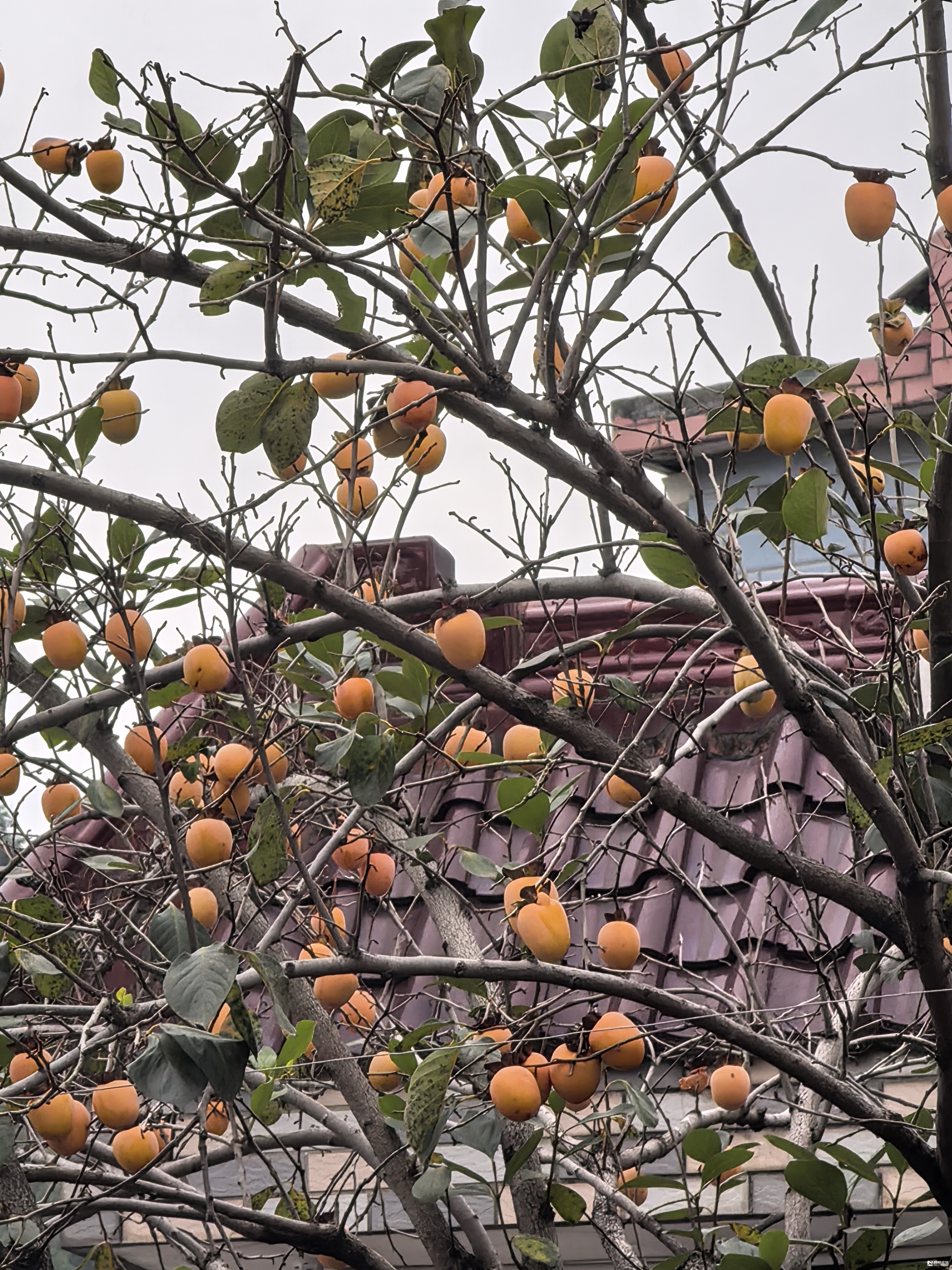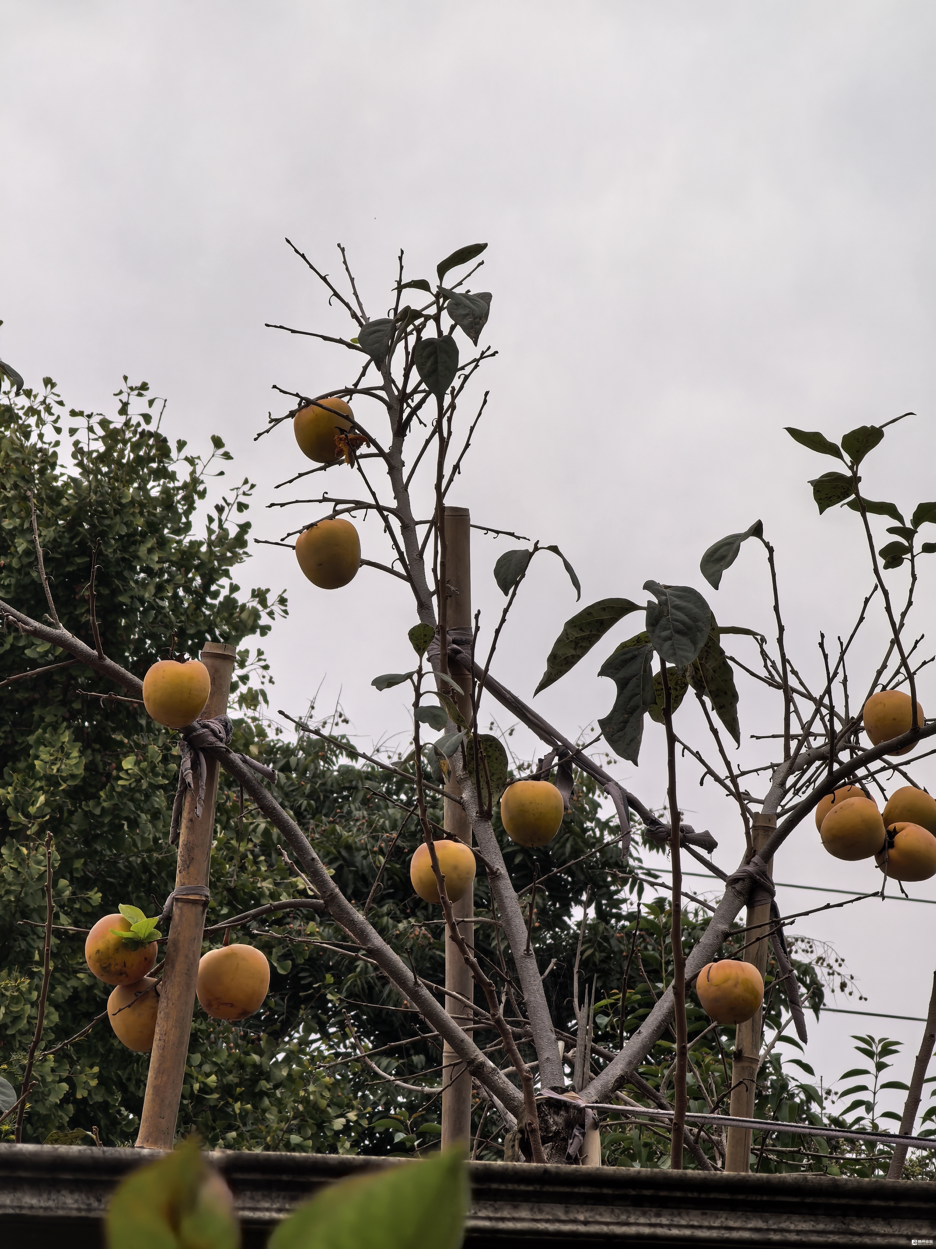 秋的尾巴, 柿子成熟了,形状不一,一个个似灯笼挂在树枝上,装饰着美丽乡村。