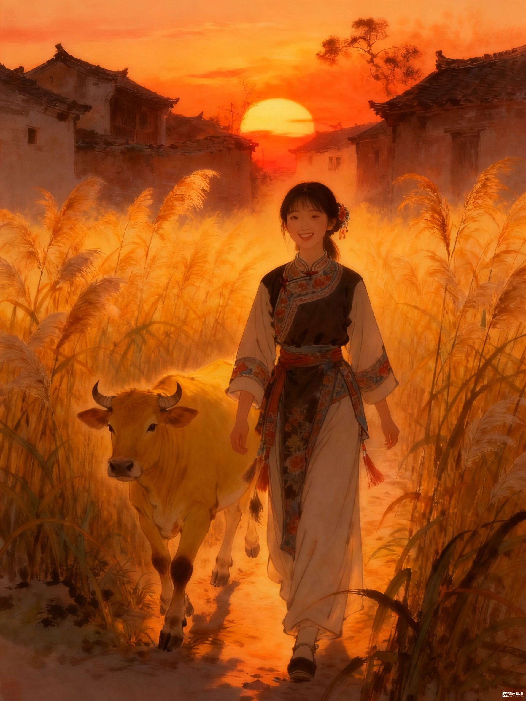 橘红的夕阳把天烧得滚烫,芦苇荡里金芒乱颤,她穿着绣满花的长衣,腰间红带系着流苏,和黄牛并肩走在小径上。古村的灰墙在余晖里泛着暖棕,树影被拉得老长,每一缕风过,芦苇就摇出片碎金