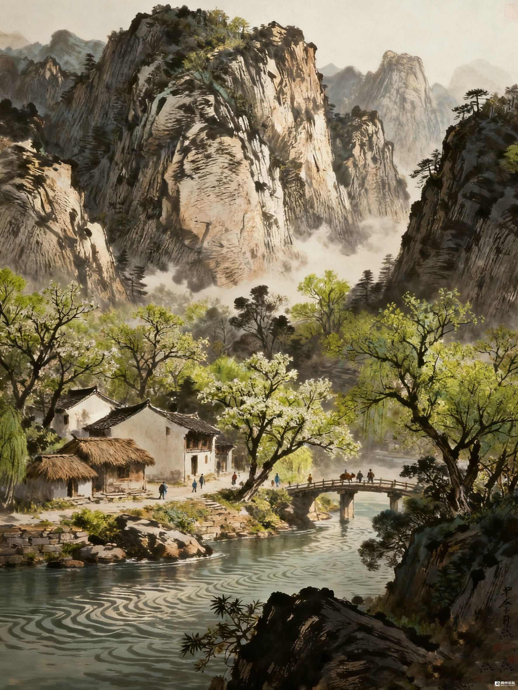 群山如黛,岩壁皴得苍劲,云雾在山坳里悠悠晃着。山脚下的溪流水波粼粼,白墙黛瓦的屋舍藏在绿树间,草顶小屋透着乡土气。石桥上行人骑马,岸边的树绿得深浅不一,还有棵树绽着白花,把春的鲜活泼满了画面