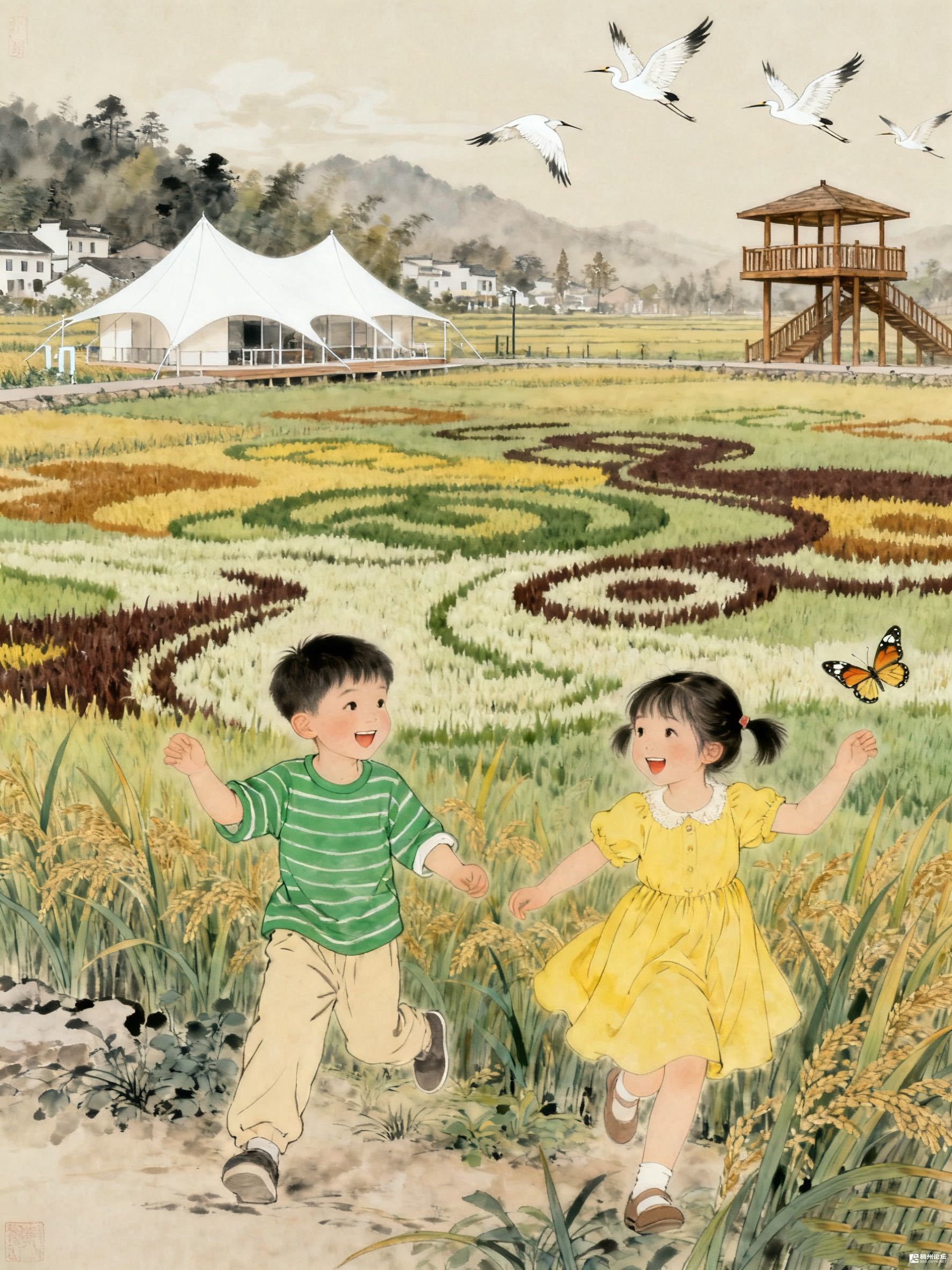 稻田里的彩稻旋出圈圈花纹,金黄的稻穗在风里晃。男孩穿绿条纹衫,女孩的黄裙像朵小太阳花,两人笑着追蝴蝶,脚丫子把泥路踩得咯咯响。白鹭在天上飞,白帐篷、木观景台立在田边,远山的白墙屋舍隐在树后,把乡野的热闹衬得刚刚好