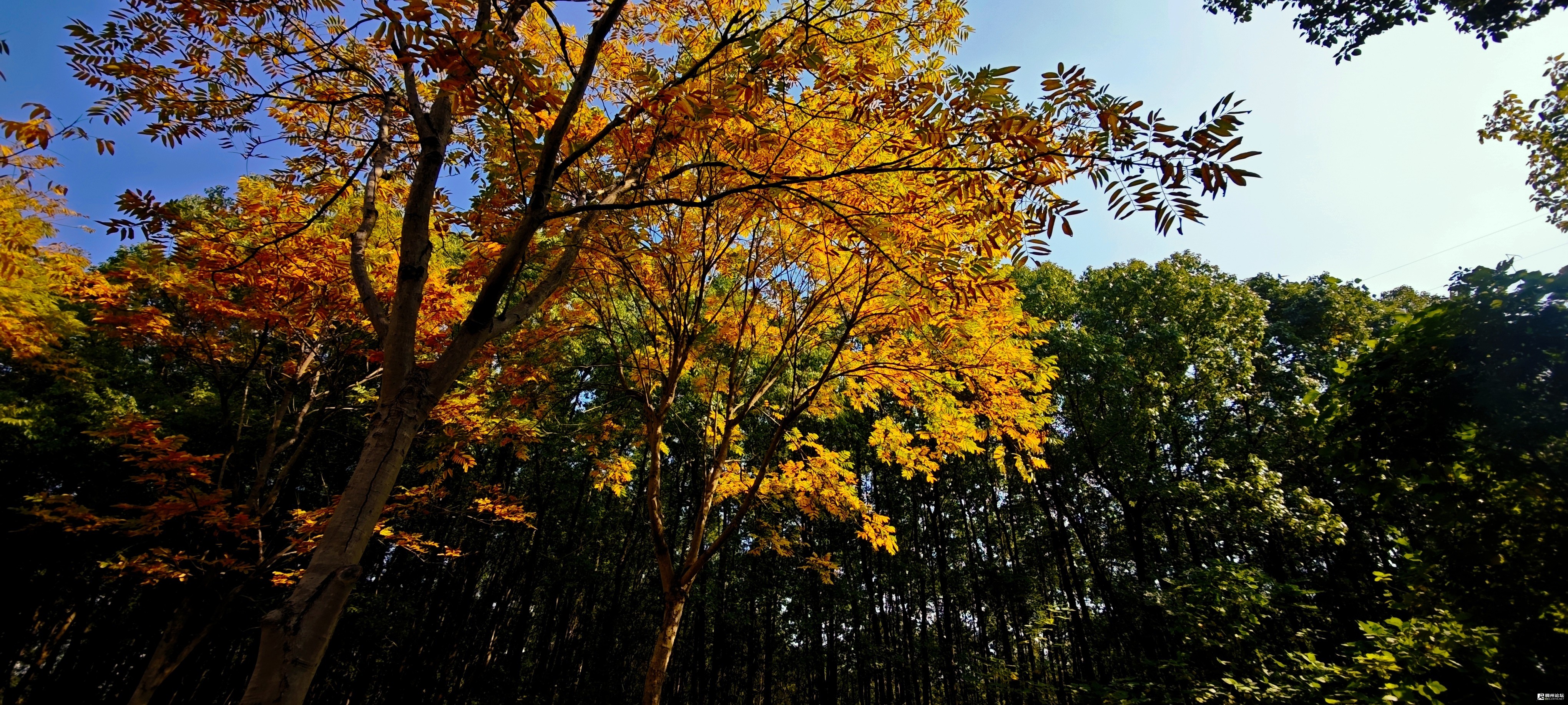 坡上的树叶泛黄了。有阳光照射,更显得暖色调的晶莹剔透。