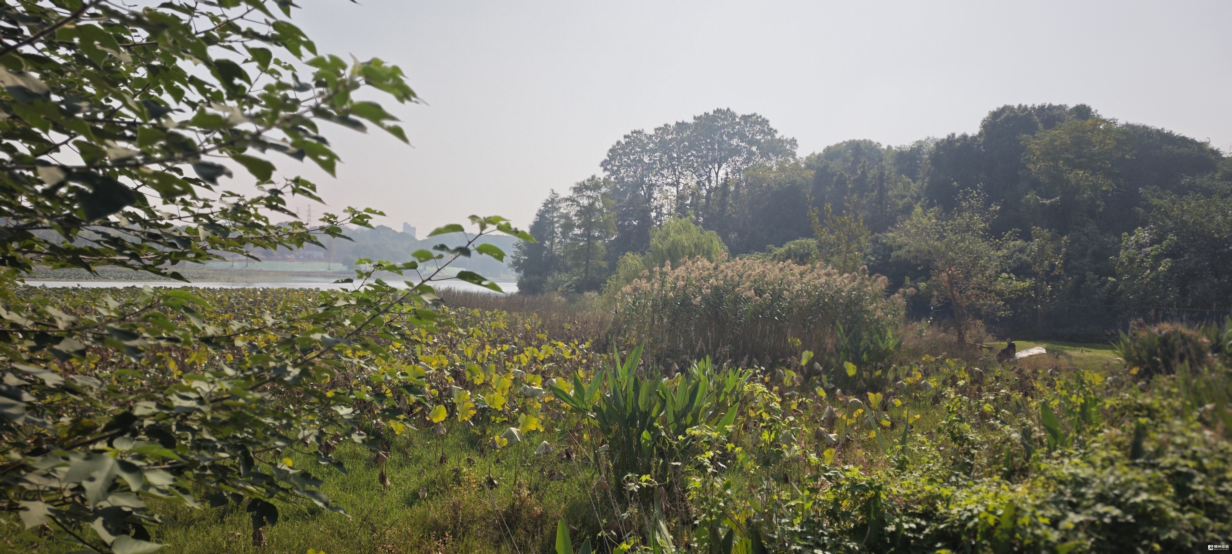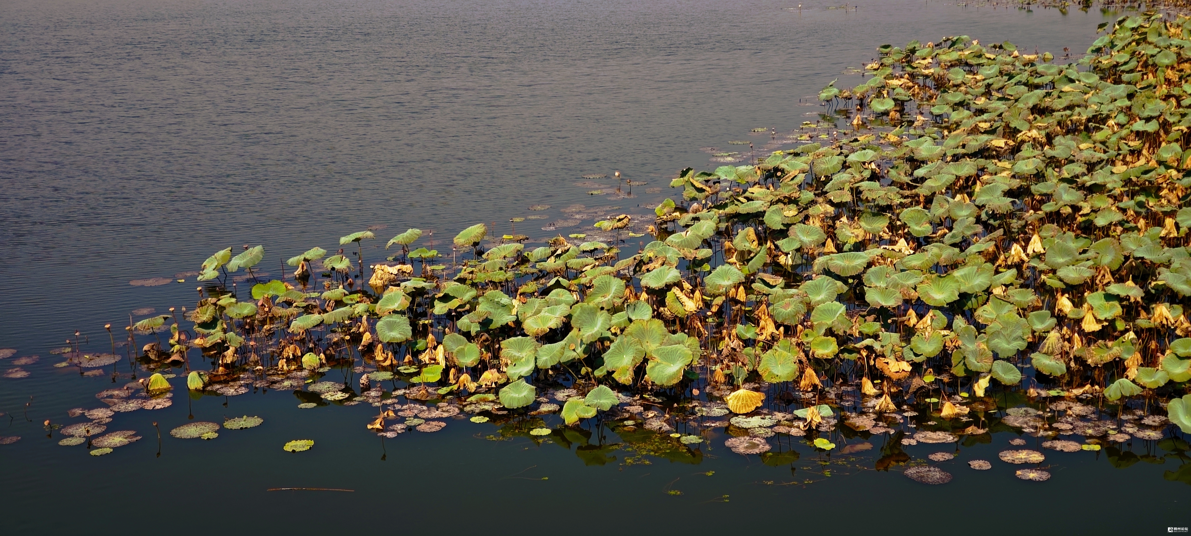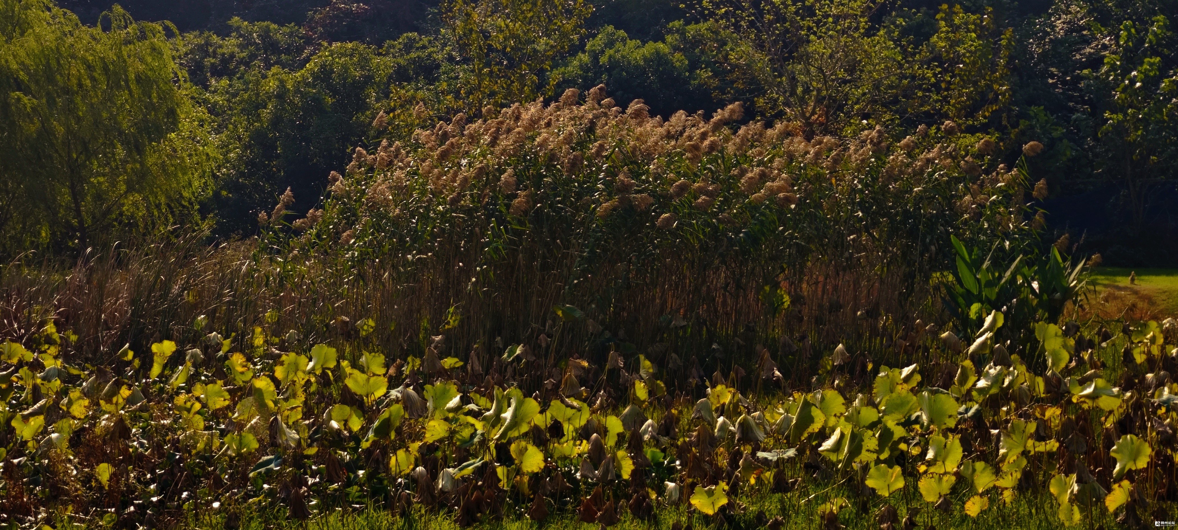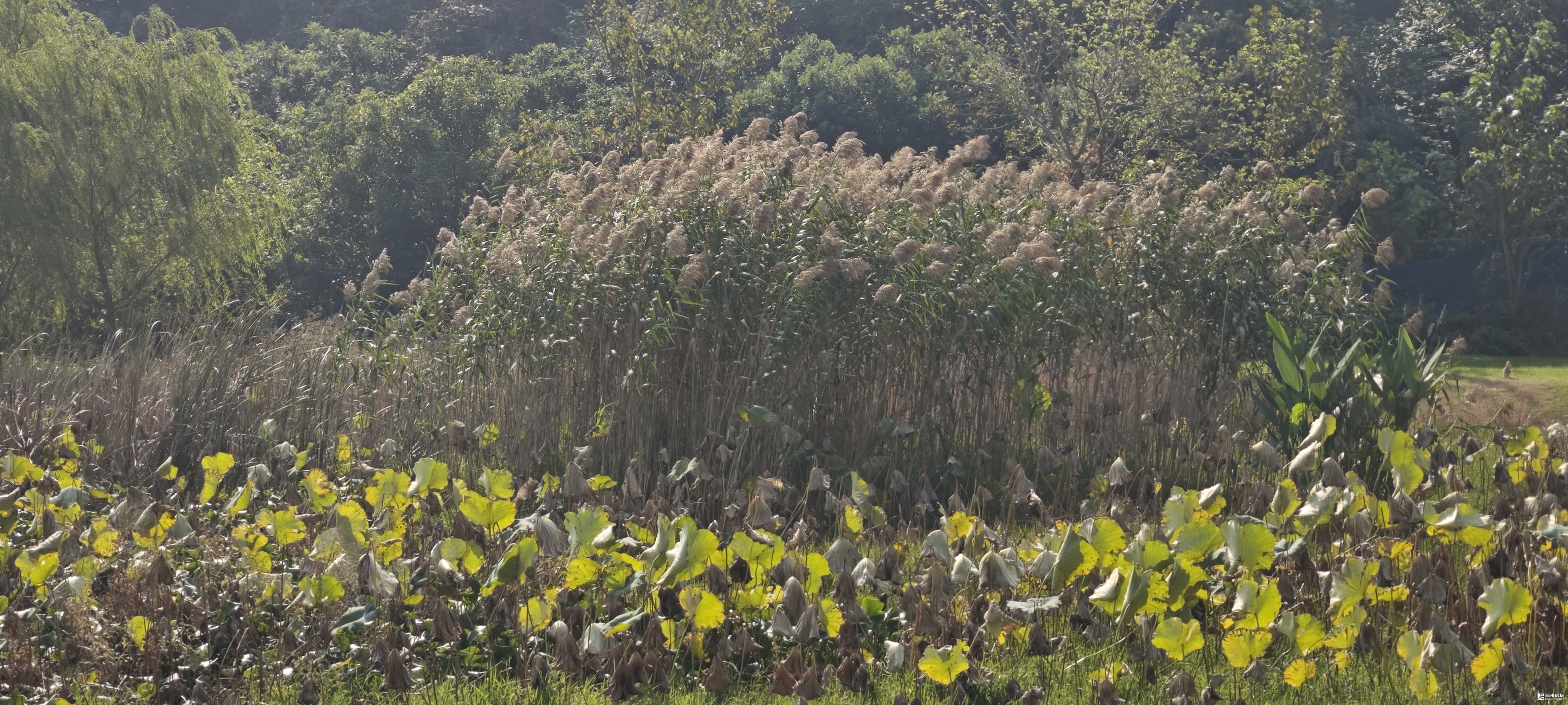 红旗水库的残荷,还是有大片的绿色。水里的芦苇和不远处坡上的树木,构成了美丽的秋冬景色。