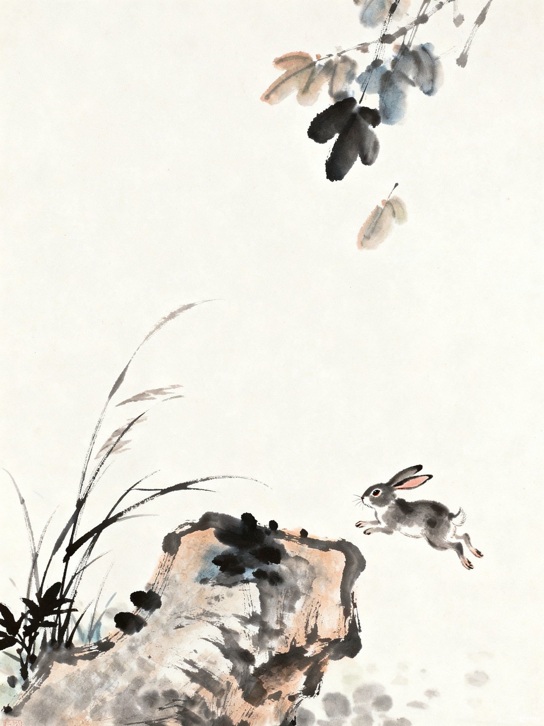 墨色的草叶在风里斜斜地摆,一块水墨石上,灰白斑驳的兔子正跃向空中,长耳朵支棱着,红眼睛亮得像星。枝上的叶有黑有褐,一片正悠悠飘落,把秋的意韵衬得清绝