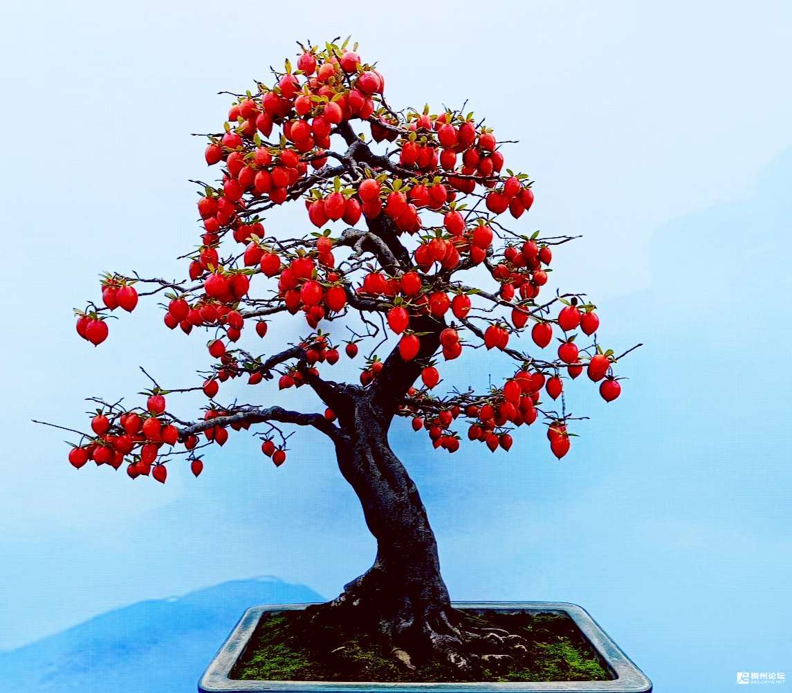 走进每一个盆景园居,我没有被雄壮大气的“大坂松”所倾倒,没有被婀娜多姿的榆树所迷恋,也没有被红叶胜似火的枫树所羁绊,而是被那挂满红柿的老鸦柿留住了脚步,流连忘返。它是红红火火的秋天里最美的主角!