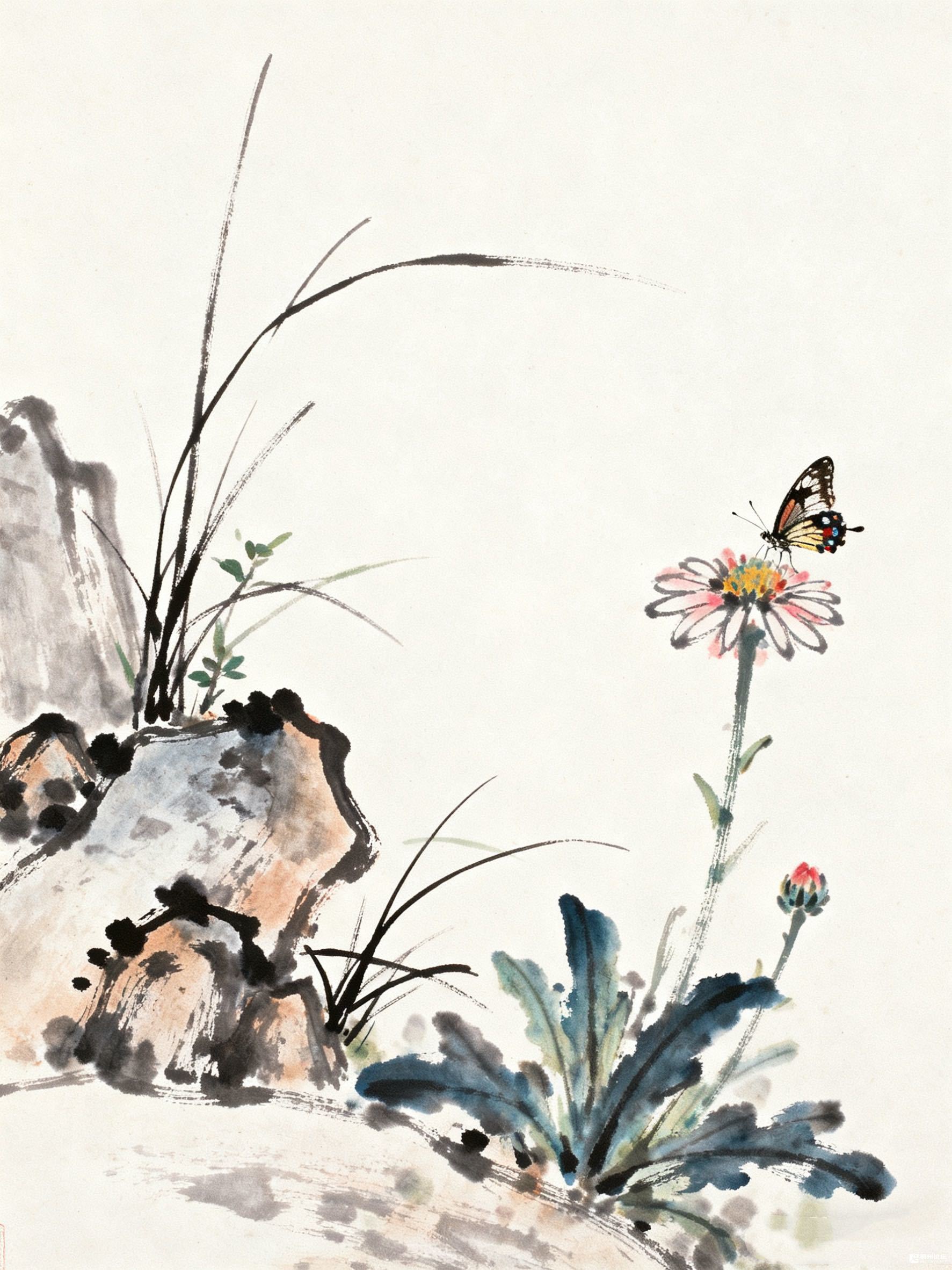 水墨的石旁,丛草劲挺,一朵粉菊开得明媚,蝶儿停在花心,翅上的黑黄斑点鲜活。旁边的花苞鼓鼓的,似在等绽放。石的肌理斑驳,草的线条苍劲,把小景的野逸衬得刚好