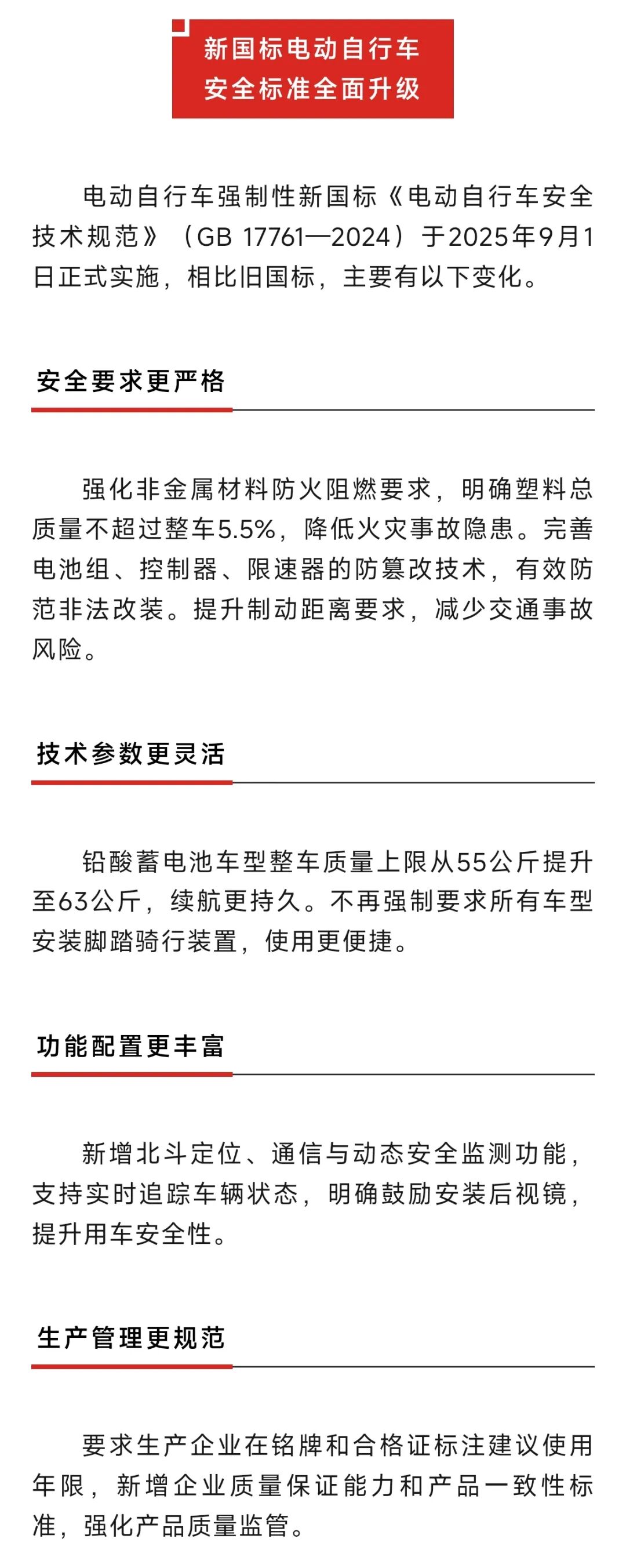 近日,国家认监委发布《关于严格电动自行车强制性产品认证管理的公告》(2025年第25号),公告指出,各电动自行车指定认证机构对依据旧版本标准出具的有效CCC认证证书,于2025年12月1日全部予以注销;对依据旧版标准出具、处于暂停状态且不能恢复有效的CCC认证证书,于2025年12月1日全部予以撤销。