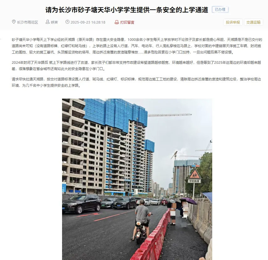 9月26日,长沙市雨花国有资产经营集团有限公司回复了天湘路及红星一路学校段建设进展,并表示,已成立专项工作组,每周调度天湘路、红星一路建设进度,优先保障学校周边路段施工,确保12月底前完成学校段主体及配套工程,彻底消除通行隐患;已向信和地产下发管理要求,要求其严格管控地块出入车辆,严禁在7:00-8:30/16:30-18:00上下学时段进行重型机械作业或材料运输,减少对学生通行的干扰。
