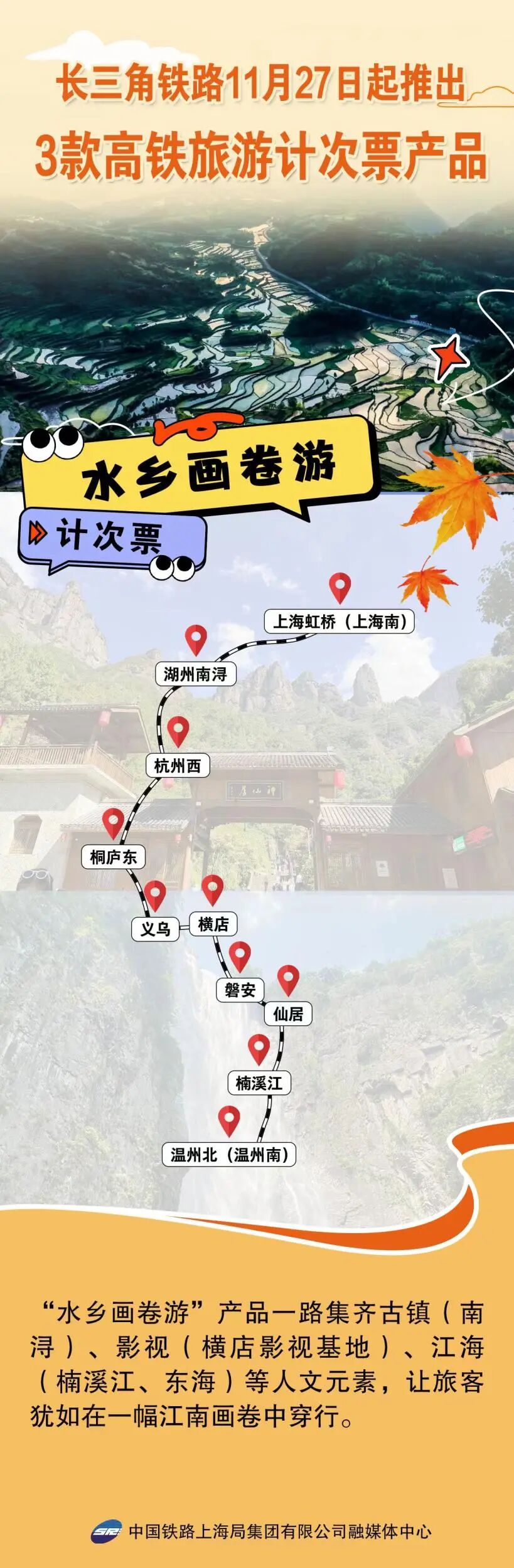 近日,记者从中国铁路上海局集团有限公司(以下简称上铁集团)获悉,为满足公众差异化旅游出行需求,促进长三角地区旅游消费,长三角铁路针对管内旅游客流出行特点,创新客票服务举措,加大客运产品供给,11月27日起推出3款旅游计次票产品,为旅客“量身”打造15日畅游长三角的乘车新体验。其中,义乌站作为杭温高铁重要枢纽,被纳入“水乡画卷游”产品,市民手持计次票即可灵活规划行程,便捷直达上海、杭州等核心城市及横店影视城、神仙居等热门景区,尽享“快旅慢游”的江南出行新体验。