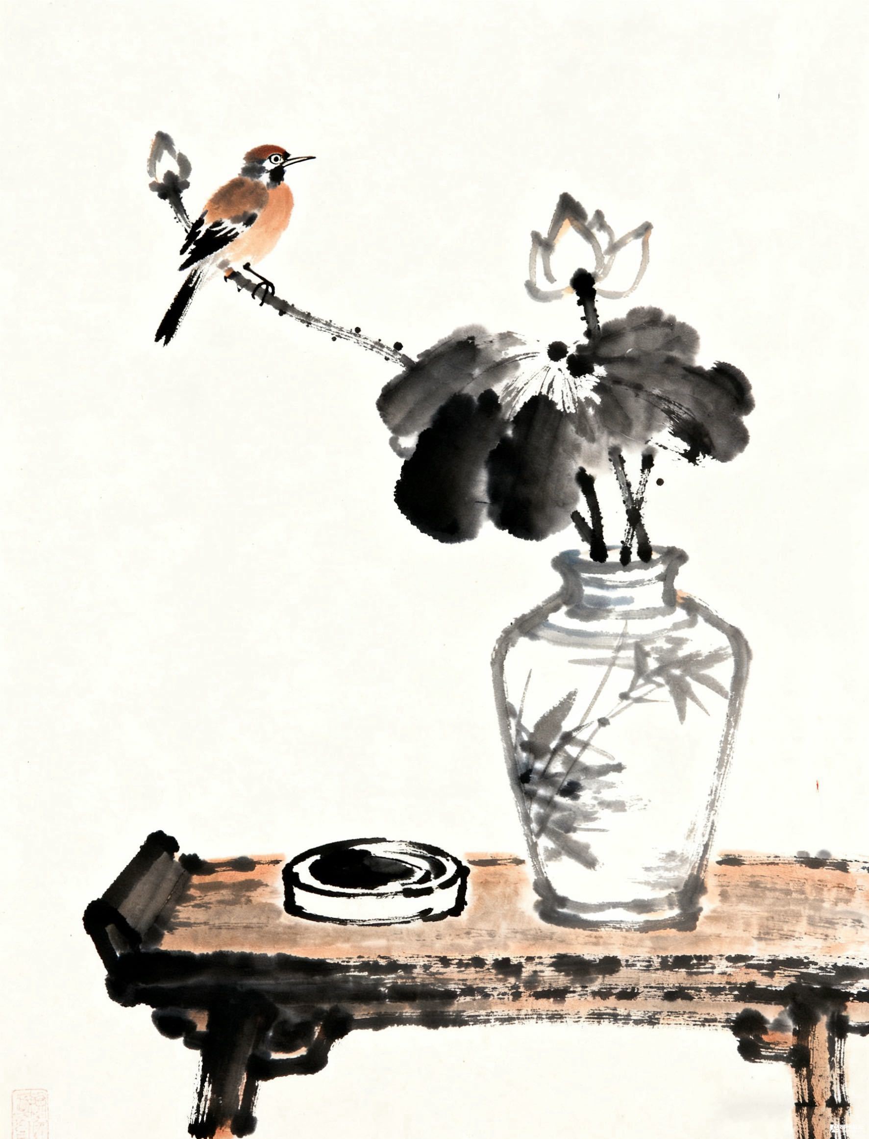 案头的荷、待研的墨、偷闲的鸟,把日子过成了水墨里的慢:不用车马喧嚣,一方几、一瓶荷,就能接住夏的清宁。这哪里是画,分明是案头刚歇下的半盏茶,余温里都裹着墨香与荷风