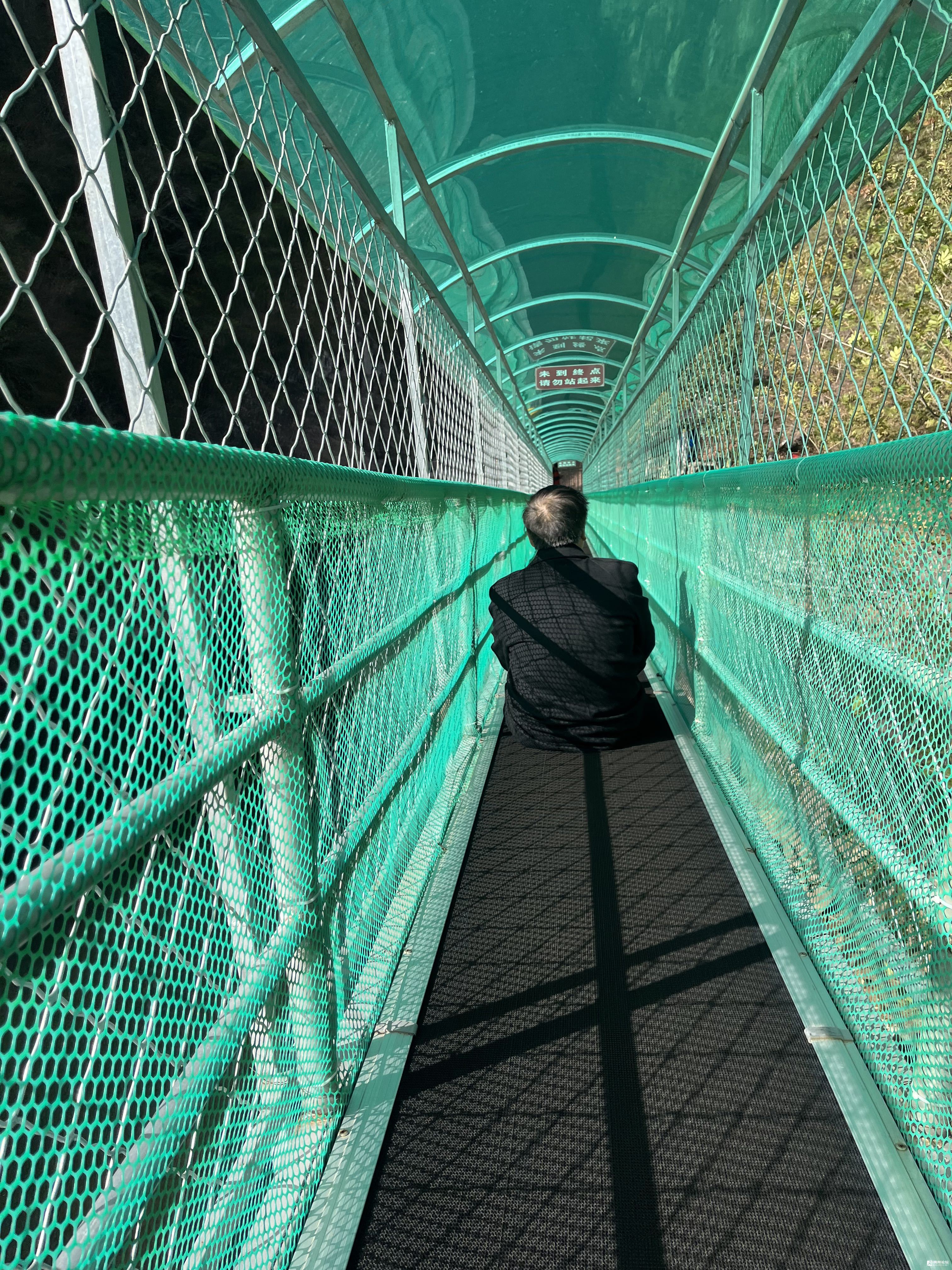 同伴们异口同声地说:“那就玩玩吧,好項目,别错过了机会。”大家谢过老板,而后随老板上去玩了。老板交待了注意事项,这“魔毯”坐上去后需十分钟才能到达终点,中途不能站起来。老板还说你们的前面已有人去了,可在这长长的“魔毯”道上,却一眼望不到人影。大家按照要求坐上了“魔毯”,“魔毯”全长大约一千二百多米,全封闭管理,左右两边采用钢丝构造,顶部采用玻璃钢瓦建造,宽八十余公分,高2、1米左右,运营速度比传输带快点,感觉还是挺好玩的。我国内国外走得多了,像“魔毯”这种款式的游玩項目,我闻所未闻,从未见过,自觉有点孤陋寡闻了。问大家,大家都说没见过,也都是第一次尝试。快到终点时,只见有两三个大汉守在门口,帮扶我们站起来。在他们的帮助下,我们顺利安全的完成了乘坐“魔毯”观光旅游的美好心愿。