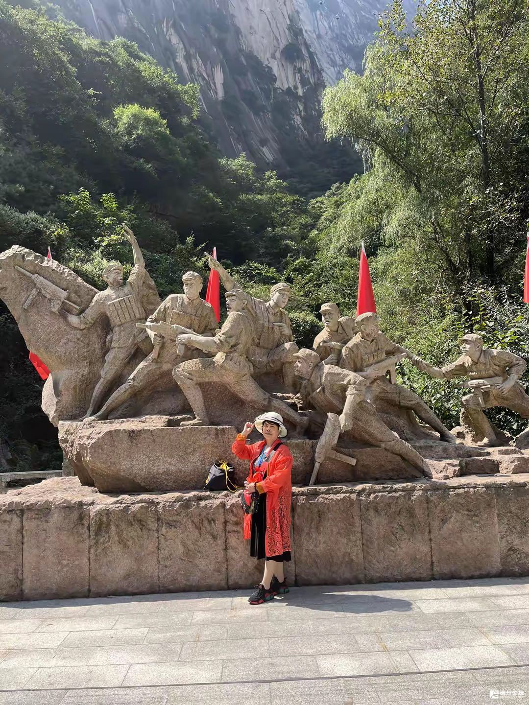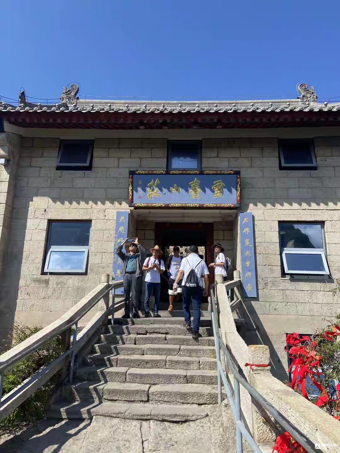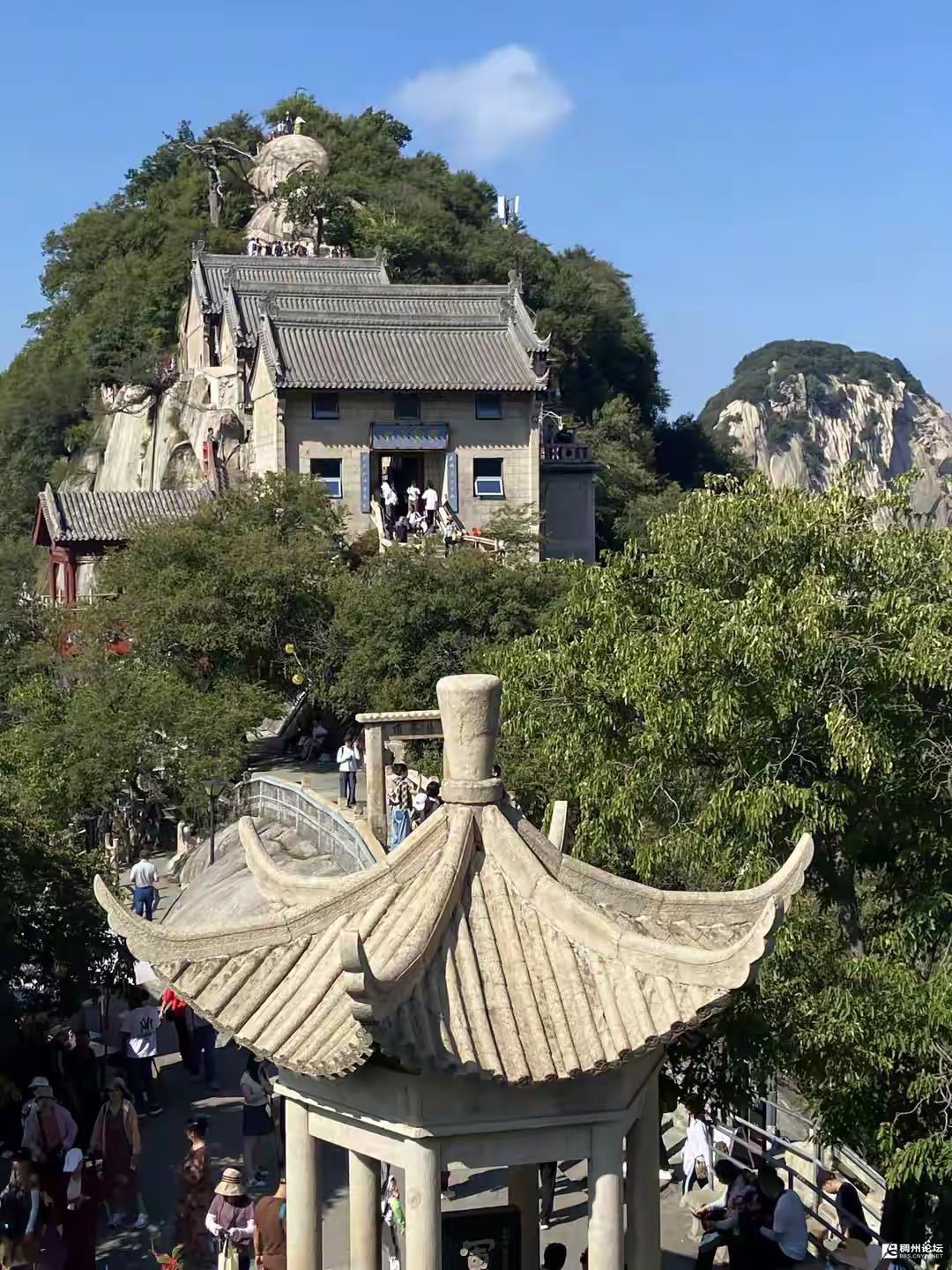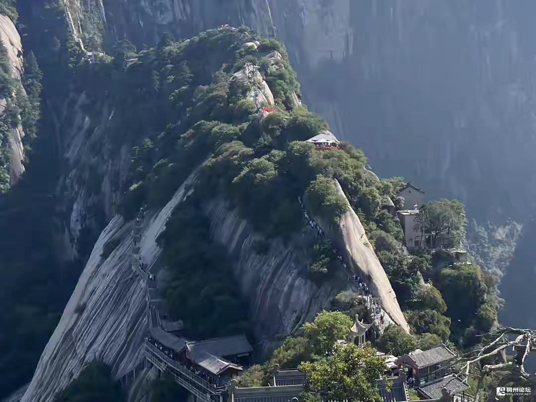 我俩边走边观赏美景,华山处处是美景,东南西北角度各不相同,观赏到的景观也各不相同。漂亮的悬崖绝壁上面,有一条建有台阶的小路,人来人往川流不息。小路一边朝着峡谷深渊,一边靠着山体,山上树木葱茏,绿意盎然。悬崖绝壁的中部建有一片砖瓦房,此处是一个大型的休闲娱乐的观景台,观景休闲处游客众多,生意兴隆,异常热闹。