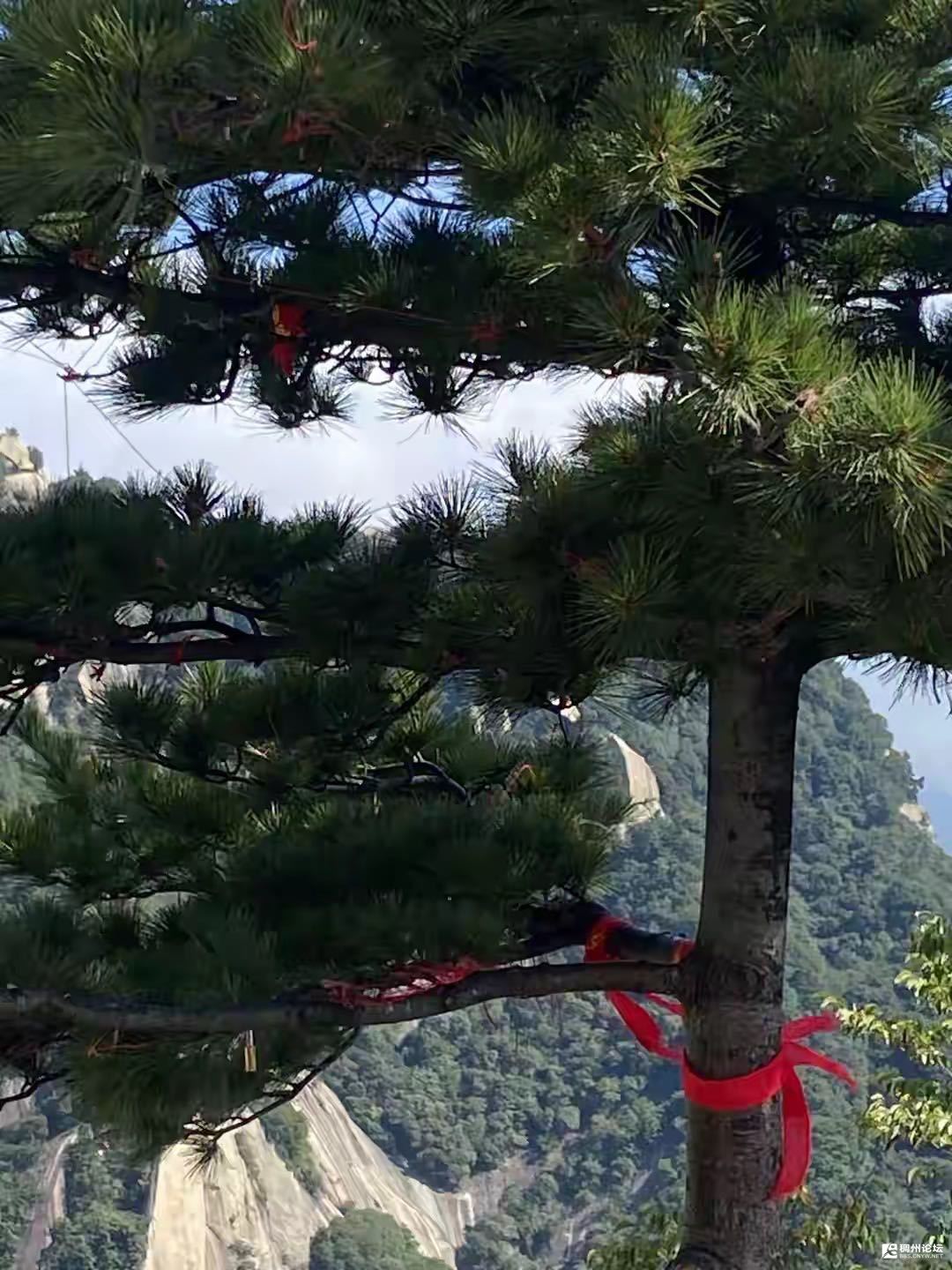 我与小蕾走进了北峰顶大门,往里走不多远,迎面撞见了一棵参天千年松,此松树粗壮高大,伟岸挺拔,松针秀丽,青翠欲滴。臻臻风骨,豪气干云,实乃树中之王山中之珍宝也。千百年来,她如同一个卫士般的守护着华山天险。穿过树缝,我们可看到华山上波澜壮阔千姿百态的迷人风光。