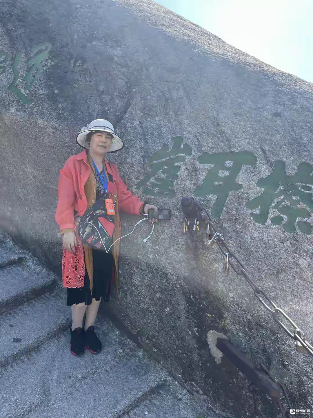 我与小蕾一鼓作气,登上了北高峰。站在山巅上,豪情满怀,极目远眺,只见那群山万壑,精彩纷呈,悬崖绝壁,风光无限。果真有“会当凌绝顶,一览众山小”的感觉。北高峰山顶上人来人往,游客众多。旁边立有一块山形平面巨石,巨石上写有“华山论剑、金庸题”七个大字,作为一处景点,吸引游客前来拍照留念。我们玩够后,离开了北高峰,一路上说说笑笑地观光游览,风景依然是那么的美好,阳光依然是那么的温暖,我们坚定了步伐,走出了北峰顶山门。