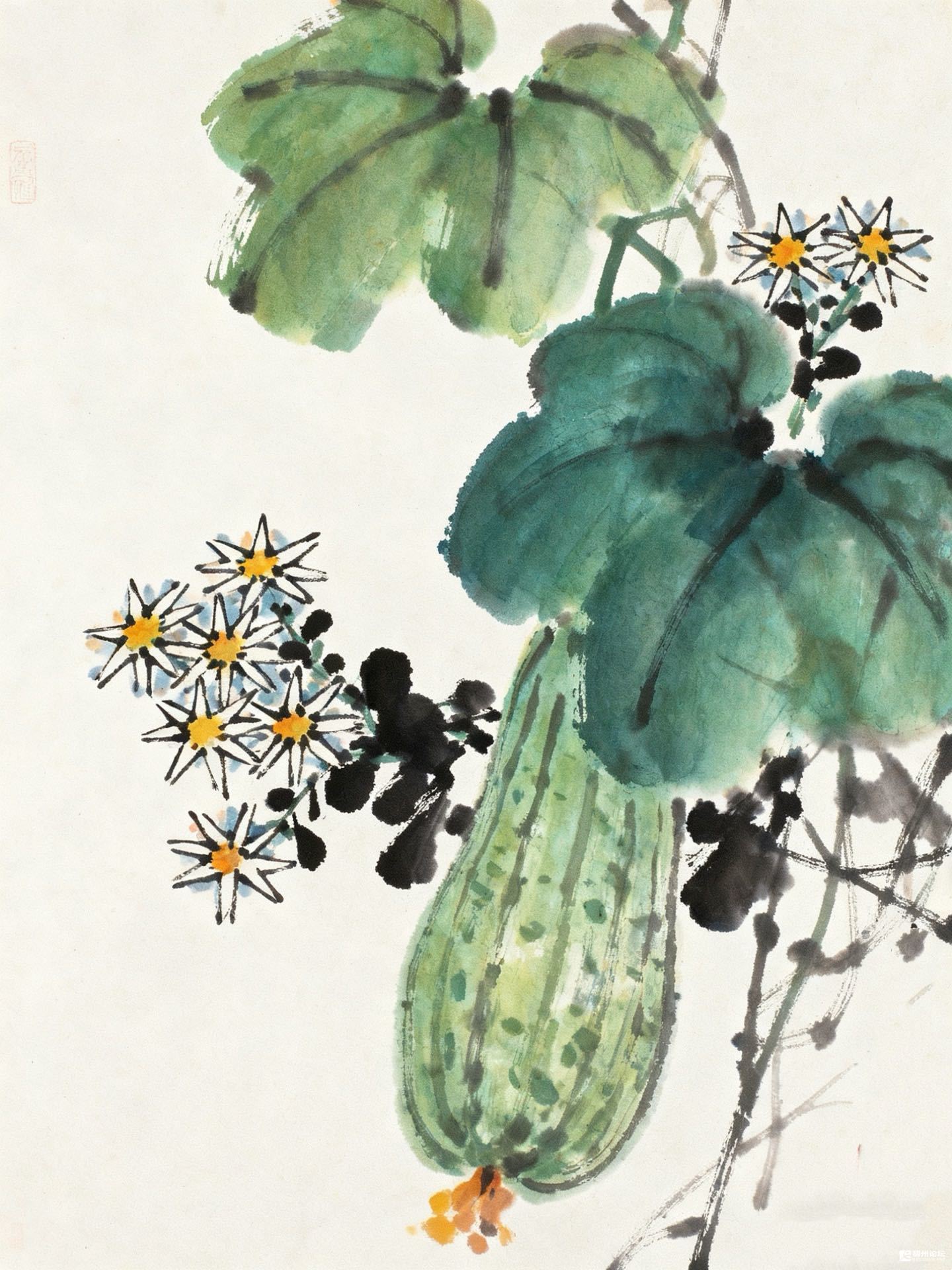 老笔扫出的瓜皮肌理糙得实在,花的俏、瓜的嫩,在墨色里融得刚好。这哪里是画,分明是院角刚撞见的晌午:叶正鲜,瓜正沉,风掠过藤梢的声儿都裹着甜。不用满架的闹,这“一瓜数花”的鲜,就把夏的实与润,都揉进了水墨的薄光里。
