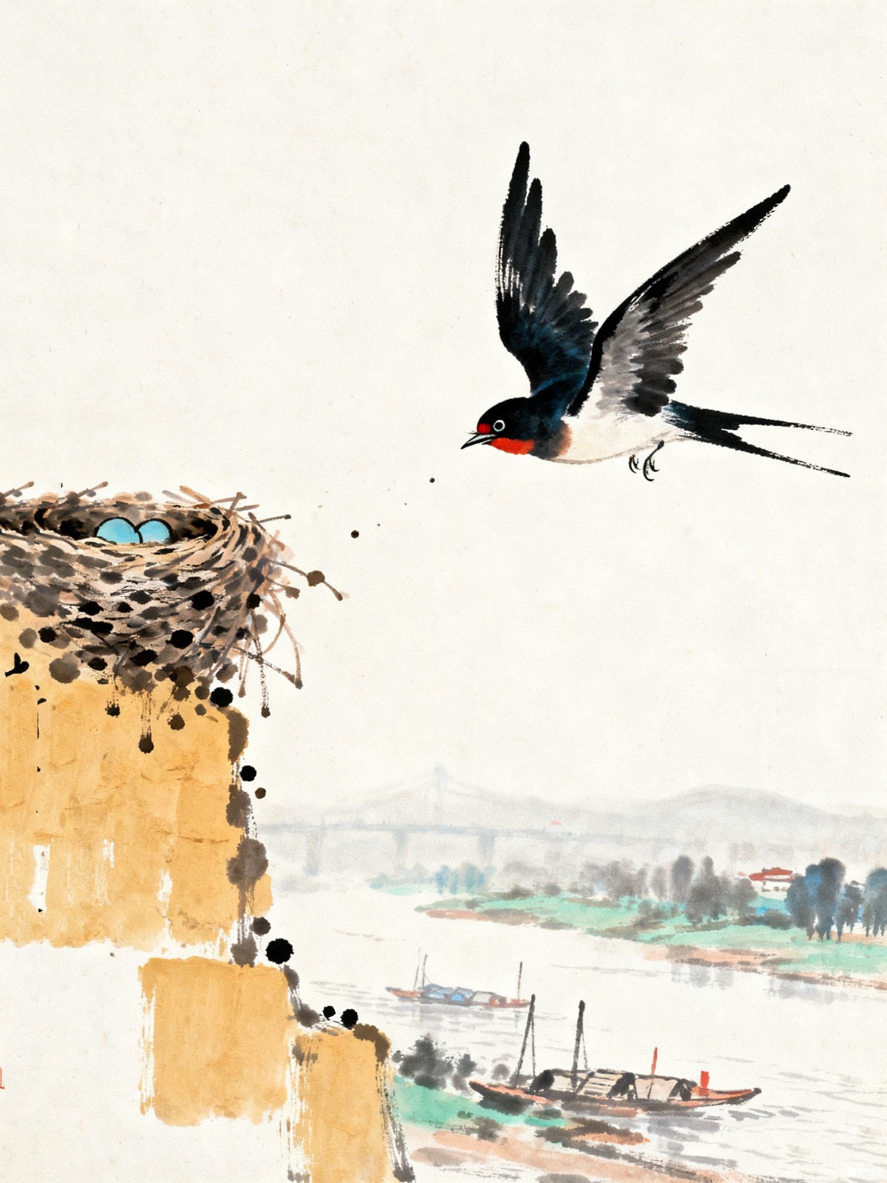 江面上船影悠悠,远处的桥与树都浸在朦胧的雾色里,衬得这燕巢与归燕愈发鲜活。它从江南的烟雨中飞来,掠过流水,掠过船篷,把远方的风与眼前的暖巢连在一起——这小小的巢,是它跨越山海也要回的家,而那两枚蛋,正等着被春的温度孵成新的翅膀,再去丈量更辽远的天空。天地间,便因这往返的燕,有了生生不息的温柔韵律。