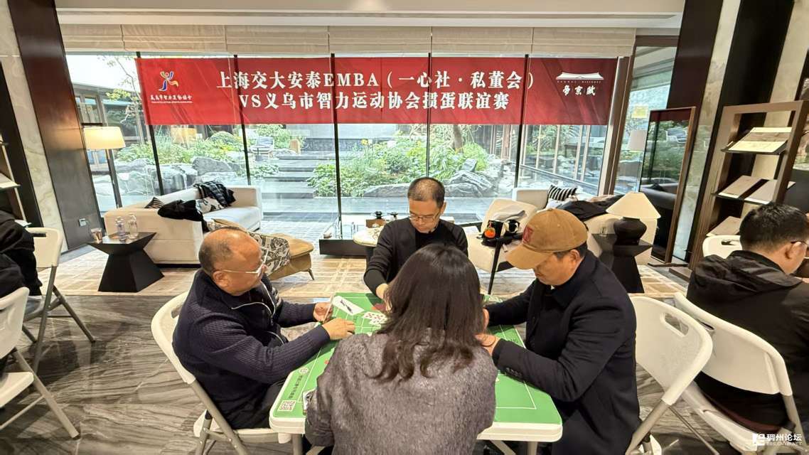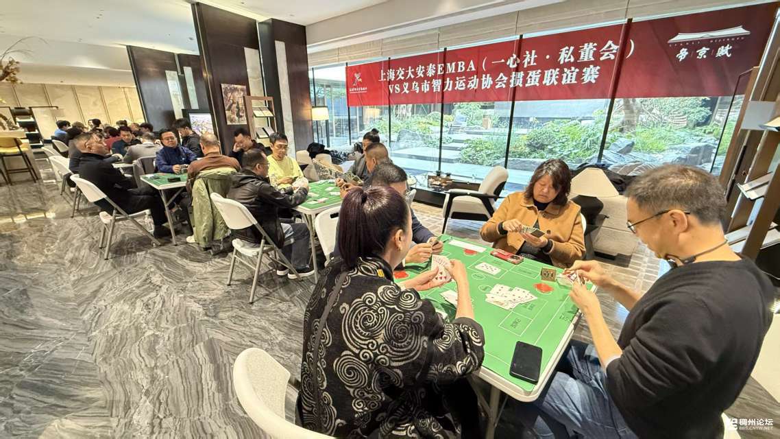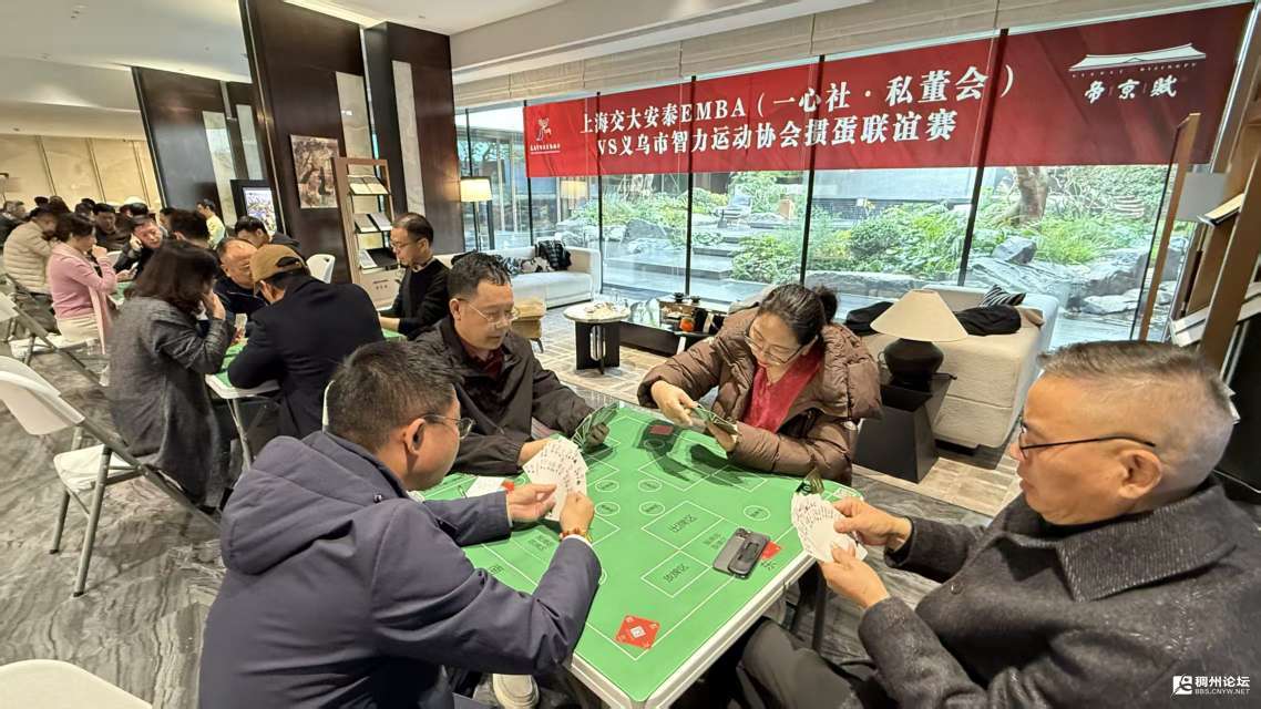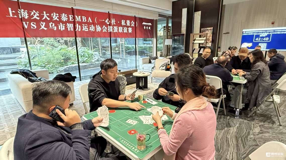 牌桌上,纸牌翻飞,博弈无声;牌桌外,思维碰撞,笑语盈盈。12月12日下午,在义乌宾王路核心地段的“联利·帝京赋”内,一场掼蛋联谊赛正酣畅进行。对阵双方并非寻常牌友,而是来自义乌市智力运动协会与上海交大安泰EMBA(一心社·私董会)的近40位嘉宾。这场在高端人居空间里展开的智慧交锋,标志着一场主题为“聚商智·弈未来”的深度跨界联动正式启幕。