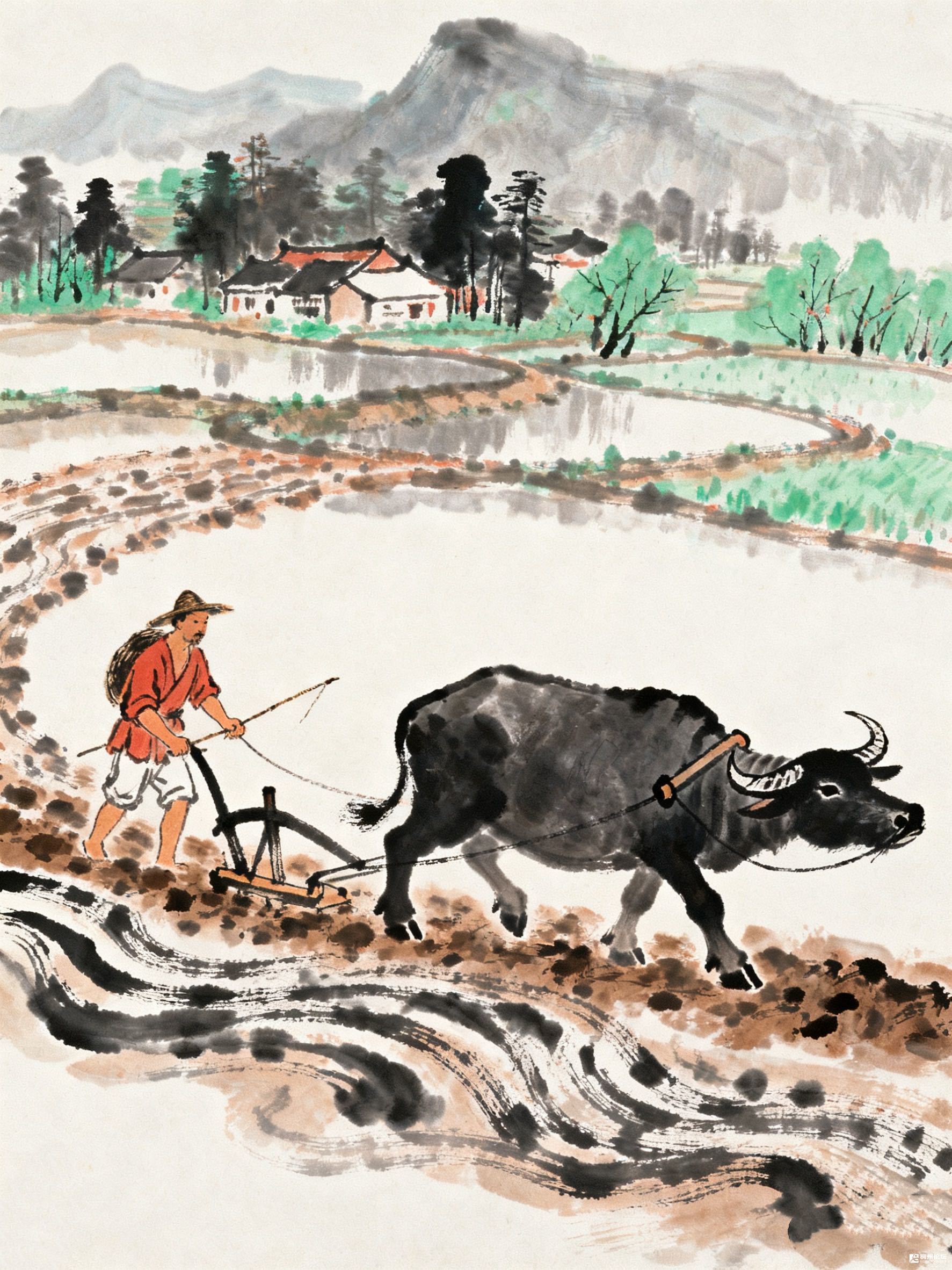 春深时,田埂间的水汽漫过青衫衣角。老水牛踏着泥浪,犁铧破开冻土,翻出的泥块像被揉碎的墨玉,在晨光里洇着湿润的光。农人草帽沿的影子落进田垄,他握着犁杖的手结着厚茧,却似与这头老牛、这片水田长在了一起。远处村落卧在薄雾与绿树间,屋瓦泛着暖棕,炊烟还未升起,可泥土的腥气里已裹着新稻的甜。耕牛的蹄印是大地的诗行,农人每一步都踩在季节的韵脚里,把春日的希望,一犁一犁种进岁月的肌理。