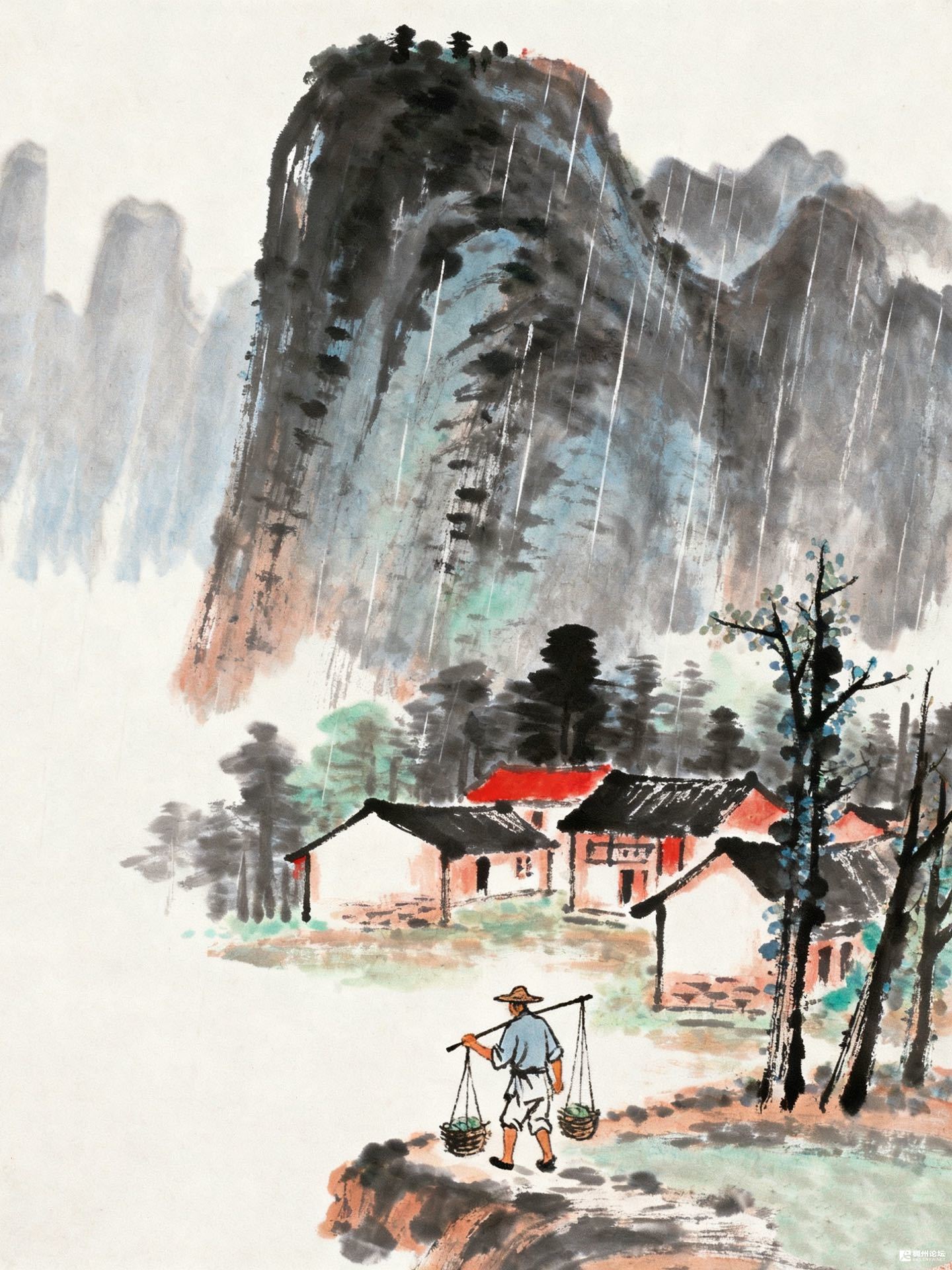他挑着担,竹扁担吱呀响,雨珠顺着斗笠檐往下掉,砸在鞋边的泥里。筐里的菜该是带着露的,绿莹莹的,和雨雾里的树色融在一块儿。