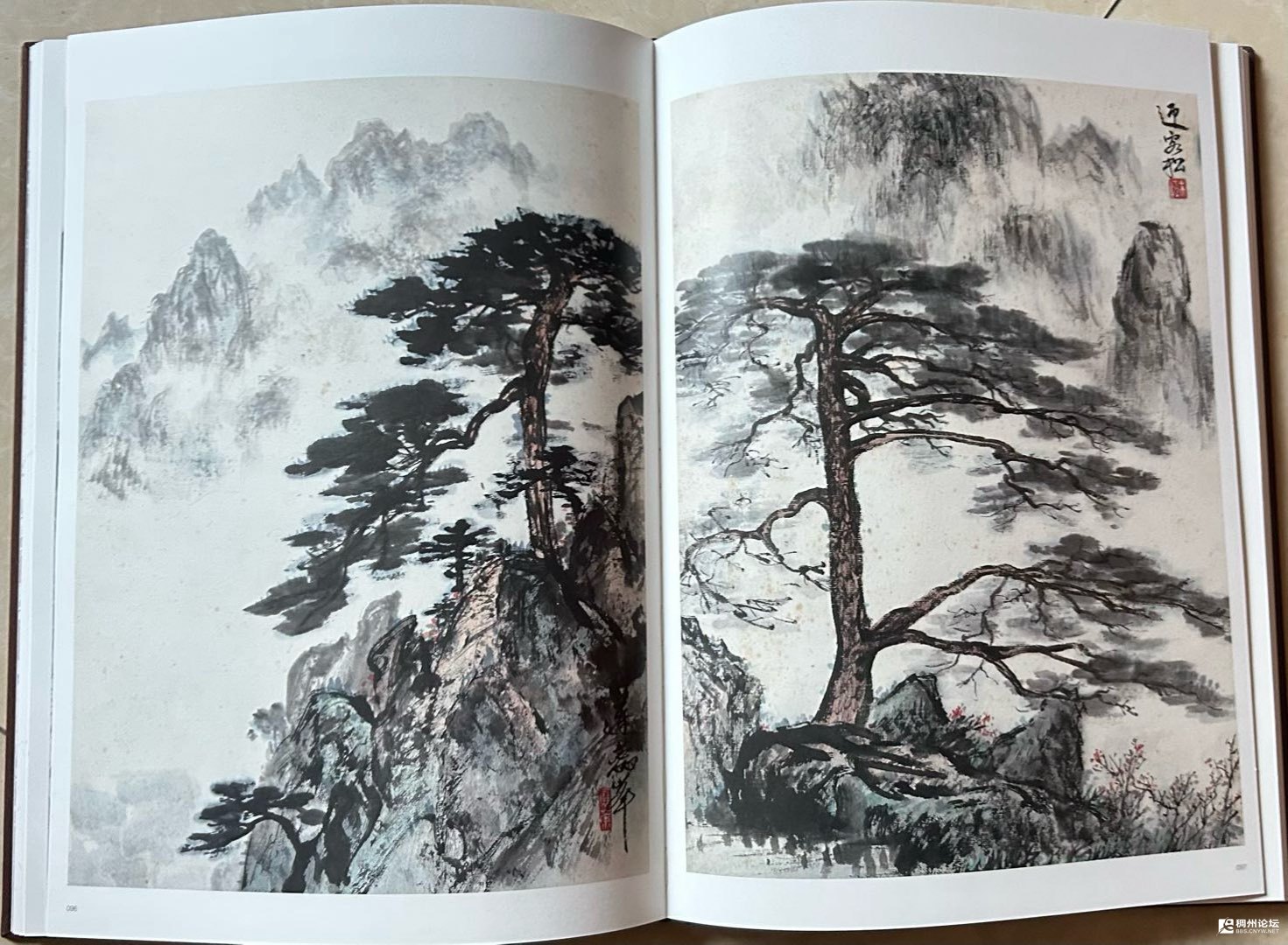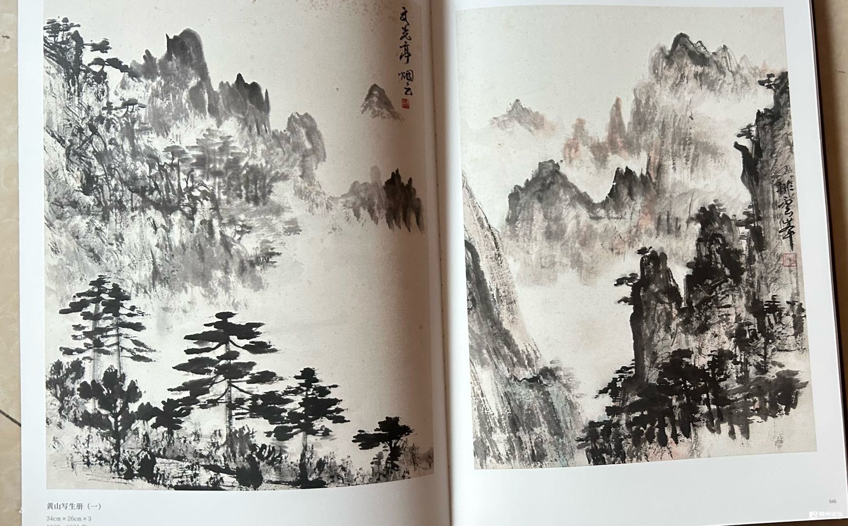 这幅对开山水松图堪称传统意趣与个人笔墨风格交融的佳作:它以水墨为骨,借浓淡墨色的层次铺陈——焦墨勾勒出松针的苍劲茂密,淡墨晕染出云雾的空灵悠远,线条既守“骨法用笔”的劲道,又含写意挥洒的灵动,将松枝虬曲、山石嶙峋的质感精准传递,把松树“坚劲不屈”的气质刻画得入木三分。构图上,左右两页景境呼应:左页松立危崖、远山层叠,右页松伴浅滩、云雾留白,以“虚实相生”的布局织就“可游可居”的幽深意境,冷寂山水间,右页角落的点点红意又恰似点睛之笔,为素净笔墨添了几分柔和生机;题款与印章的排布贴合画面节奏,更让“诗书画印”的传统韵味完整落地。整幅画既承续了传统山水的审美内核,又以个人化的笔墨性情传递出清寂而坚韧的情绪,观之韵味悠长。