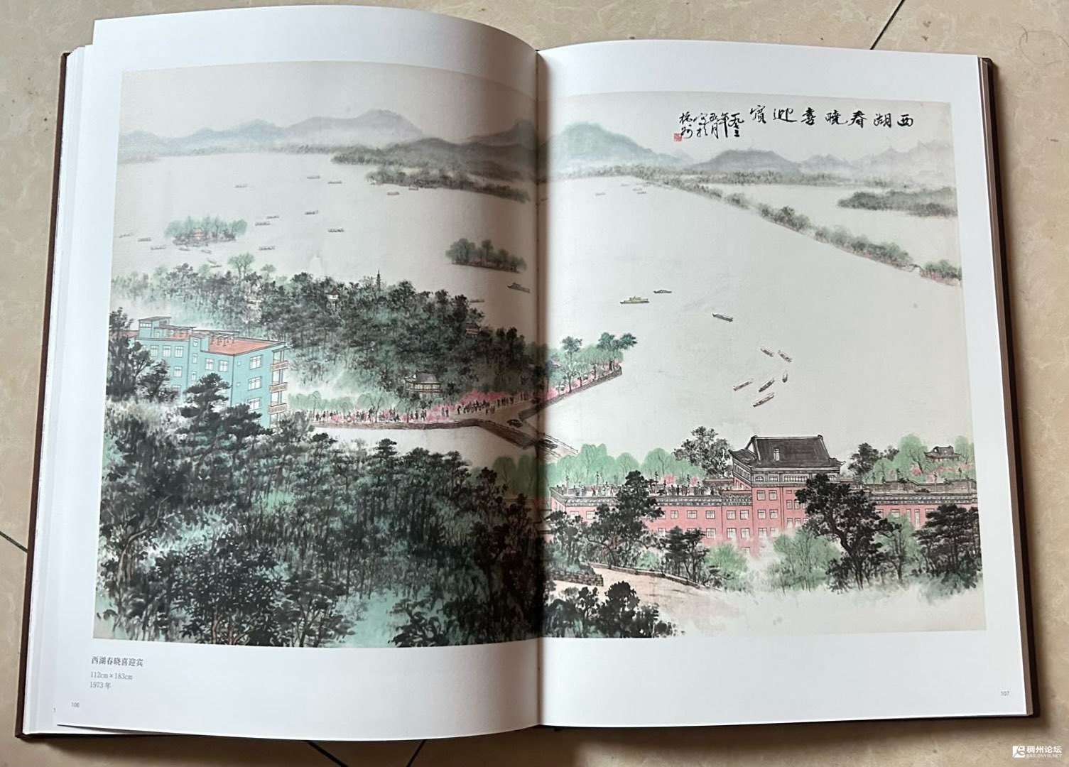这幅《西湖春眺图》是“传统笔墨写当代生活”的鲜活范例,韵味与烟火气兼具:它以浅绛山水的雅致底色铺展西湖春景,远山用淡墨轻晕出朦胧的湖光,近树以浓墨点染出葱郁层次,既守住了传统山水画的清逸意境;又将现代建筑(蓝、红楼房)、岸边人流、湖中游船自然嵌入画面,让古典湖景与当代生活场景相融——红墙楼宇的明艳、岸边人群的喧闹,和湖光山色的静谧形成柔和反差,既保留了西湖的诗意,又添了生活的鲜活温度。