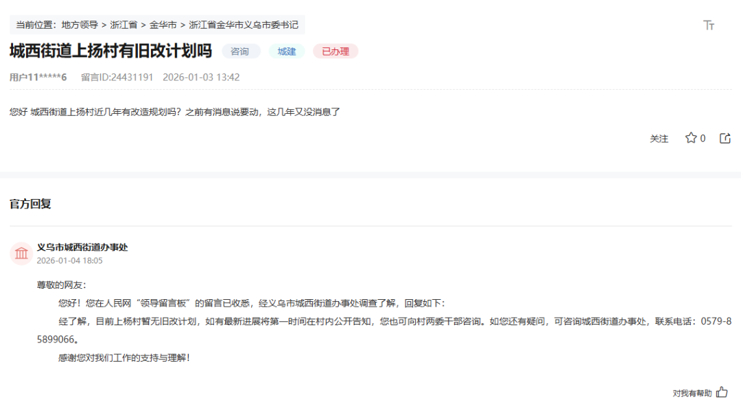 近日,有市民在网络平台咨询义乌农村旧村改造进展相关问题,现将有关部门答复进行整理。