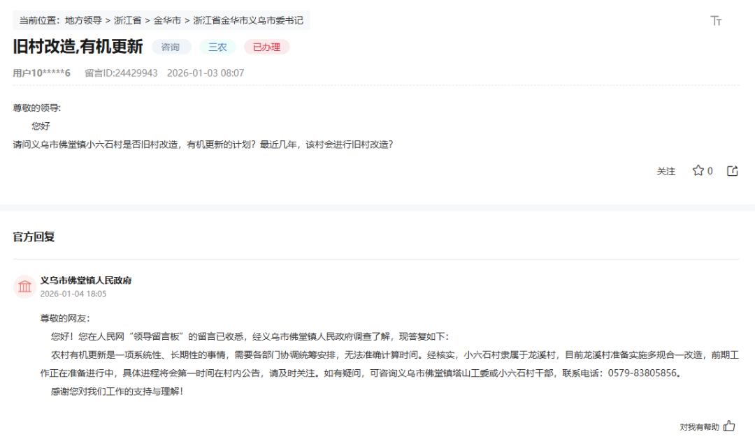 问:尊敬的领导:您好,请问义乌市佛堂镇小六石村是否有旧村改造,有机更新的计划?最近几年,该村会进行旧村改造?