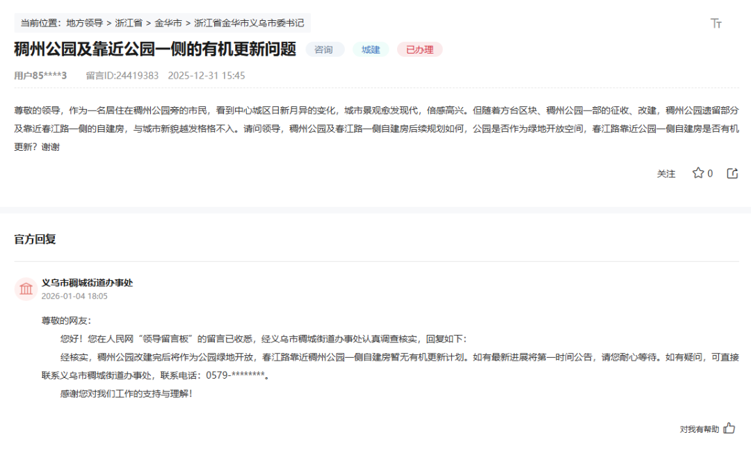 义乌市稠城街道办事处1月4日回复:经核实,稠州公园改建完后将作为公园绿地开放,春江路靠近稠州公园一侧自建房暂无有机更新计划。如有最新进展将第一时间公告,请您耐心等待。如有疑问,可直接联系义乌市稠城街道办事处,联系电话:0579-********。感谢您对我们工作的支持与理解!
