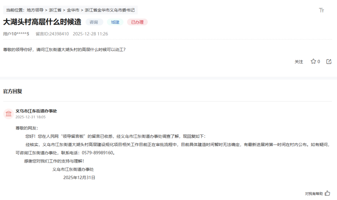 义乌市江东街道办事处12月31日回复:经核实,义乌市江东街道大湖头村高层建设规化项目相关工作目前正在审批流程中,目前具体建造时间暂时无法确定,有最新进展将第一时间在村内公布。如有疑问,可咨询江东街道办事处,联系电话:0579-89989160。感谢您对我们工作的支持与理解!
