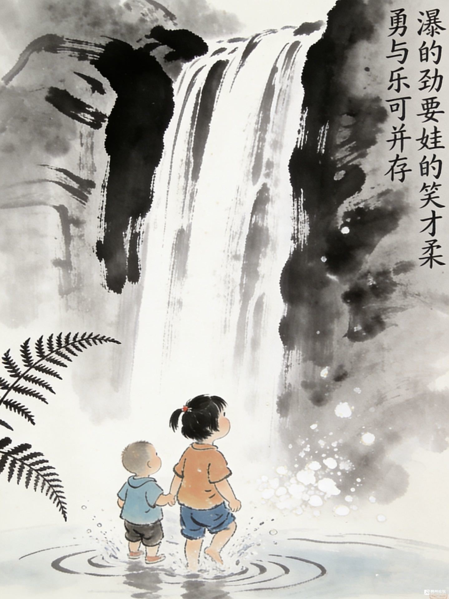 蕨叶在岸边绿得泼泼洒洒,像给这水做的画镶了边。瀑声轰隆隆的,盖过了他俩的悄悄话,可姐姐手心的暖、弟弟发颤的指尖,都比瀑流还烫——原来勇不勇的,有个人牵着,就不怕了;乐不乐的,看水砸出花来,就够了。