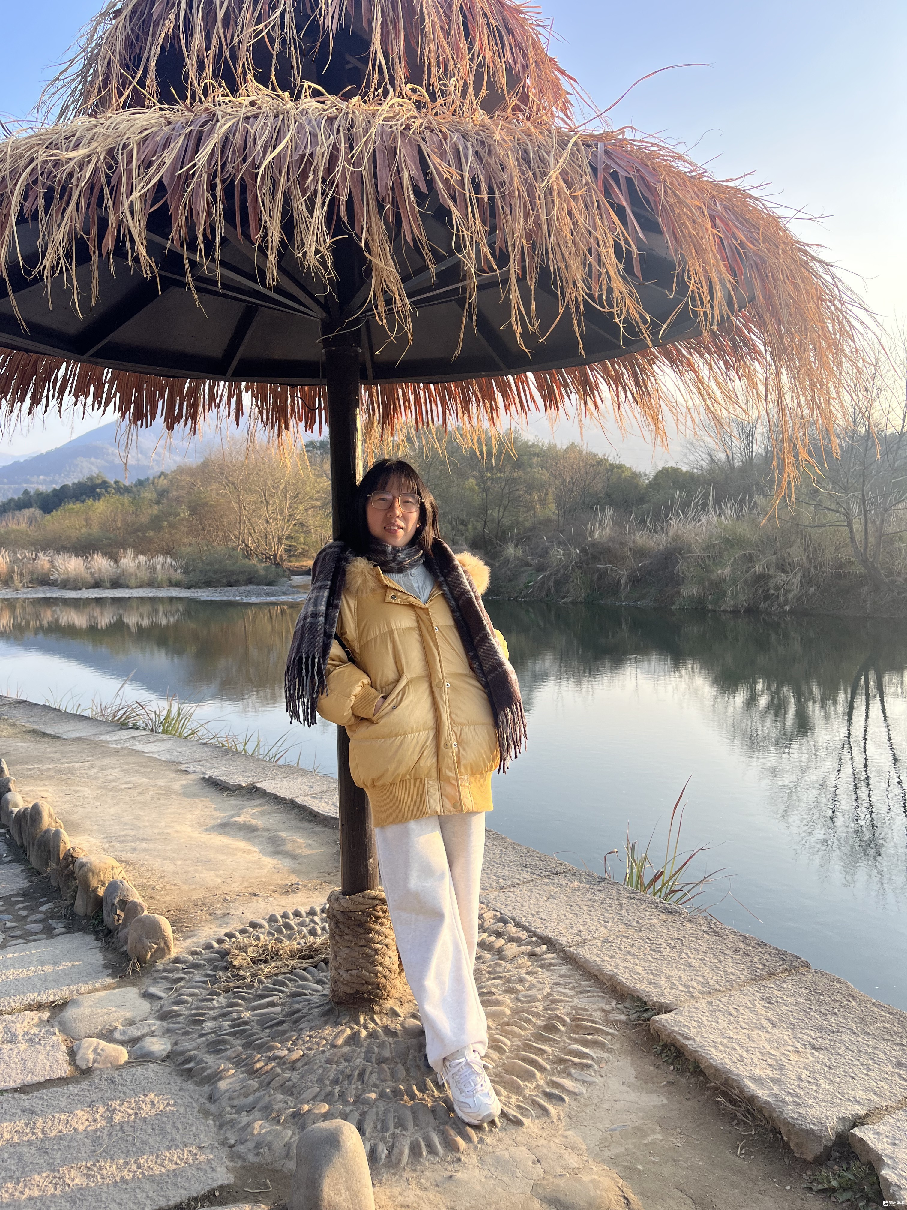 不一会儿,我们就来到了一块空地,上面树立着几块岩石。太阳暖暖的,在人身上很舒服,惟一美中不足的是风挺大,吹着感觉哆嗦。停了须臾,就继续往前。接着,来到了一个小河前,河水已经干涸,陪着女儿在上面的石头上行走,让她过了把瘾。紧接着,我们就经过了一棵古樟树前面,根据上面的介绍,已经有1500年的树龄了,树的四周围满了木架,木架上都是祈福的布条,看着不禁让人觉得肃然。然后,我们沿着河水继续往前,来到了文昌阁,这个透露着历史沧桑的建筑,让人看着不禁感到欣慰。在风雨的侵蚀下,依然屹立不倒,把自己最真实的一面,展现在世人面前。最后,我们沿着对面的路,一直走到了一个咖啡馆。这,算是今天找到最大的宝藏了吧!咖啡馆不大,估摸着也就五六十平,四周都是玻璃隔开,已经有七八个人坐着,都在懒懒地晒着太阳,还有一名歌手在慵懒地唱着流行歌曲。我们也加入了队伍,点了小吃与果茶,就着山头的阳光,欣赏着面前的江景,感受着这难得的休闲时光。而我,捧着《二十四史》,就沉浸在书本的世界里,久久地无法自拔,不断地徜徉与遨游着。