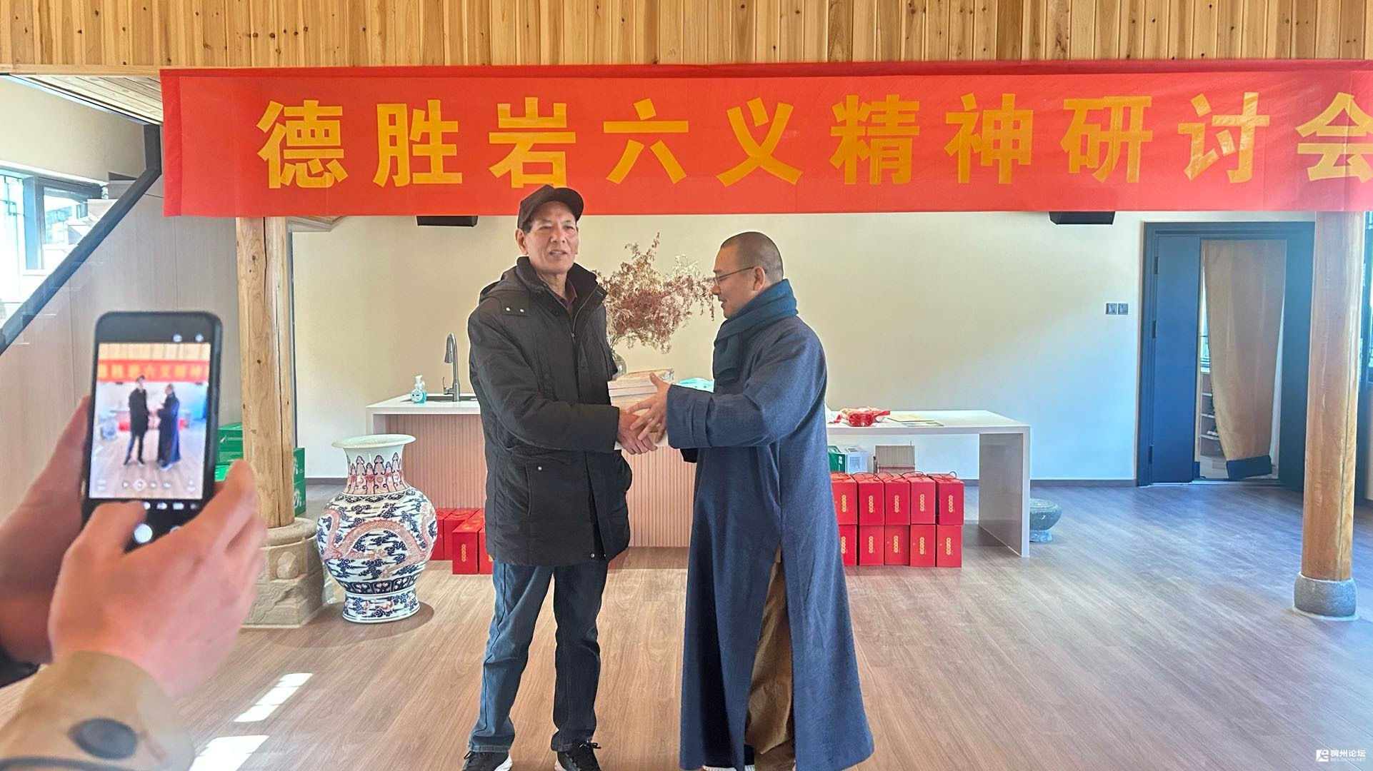 接近尾声,佛堂作协主席王春平、福田作协主席潘爱娟、上溪溪韵文学社社长陈振龙、稠州论坛绣湖文学版主成江银向方丈本善师傅赠送了精心挑选的书籍,佛堂作协副主席王和清、书画艺术家陈黎明、胡珠花亦赠送了书画给本善师傅。以表对方丈热情招待的谢意,本善方丈亦颔首致谢,书香与禅意在此间交融。随后,大家一同循着山间小径前往德胜岩,沿途草木青翠,清风送爽,远处的村落与近处的山石相映成趣,风光无限。一行人且行且谈,方才关于“六义”的探讨余韵未消,与山间的生机盎然交织在一起,让这场文化之约更添几分悠然与深意。