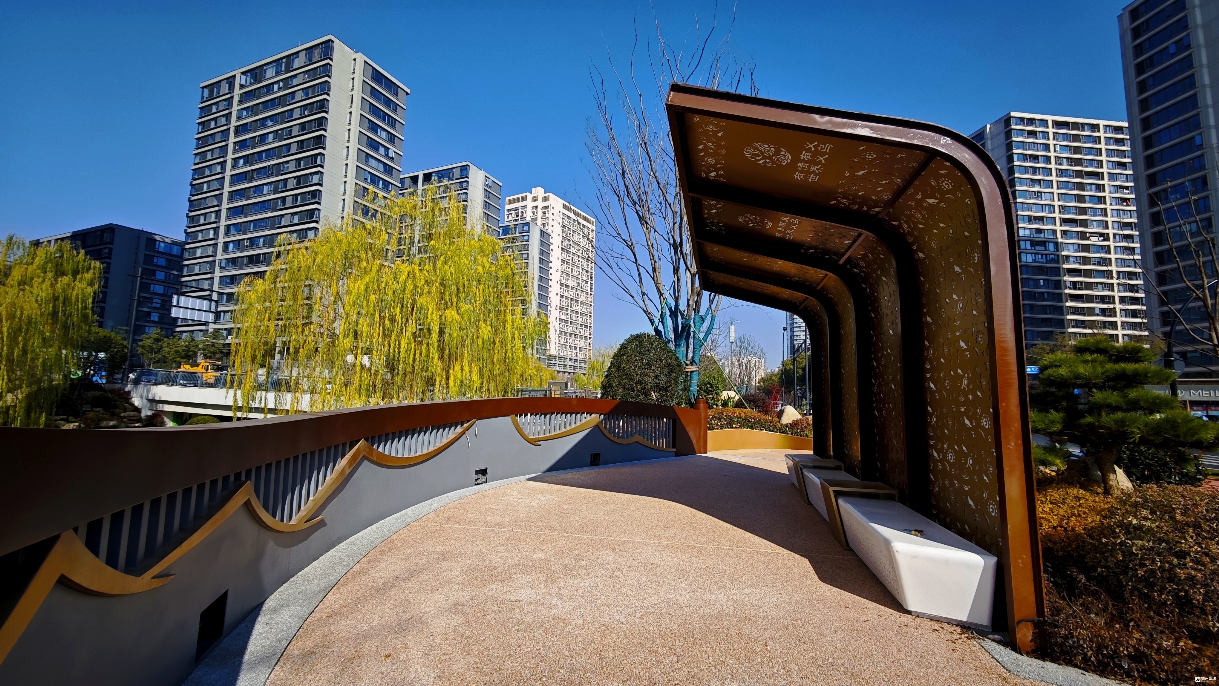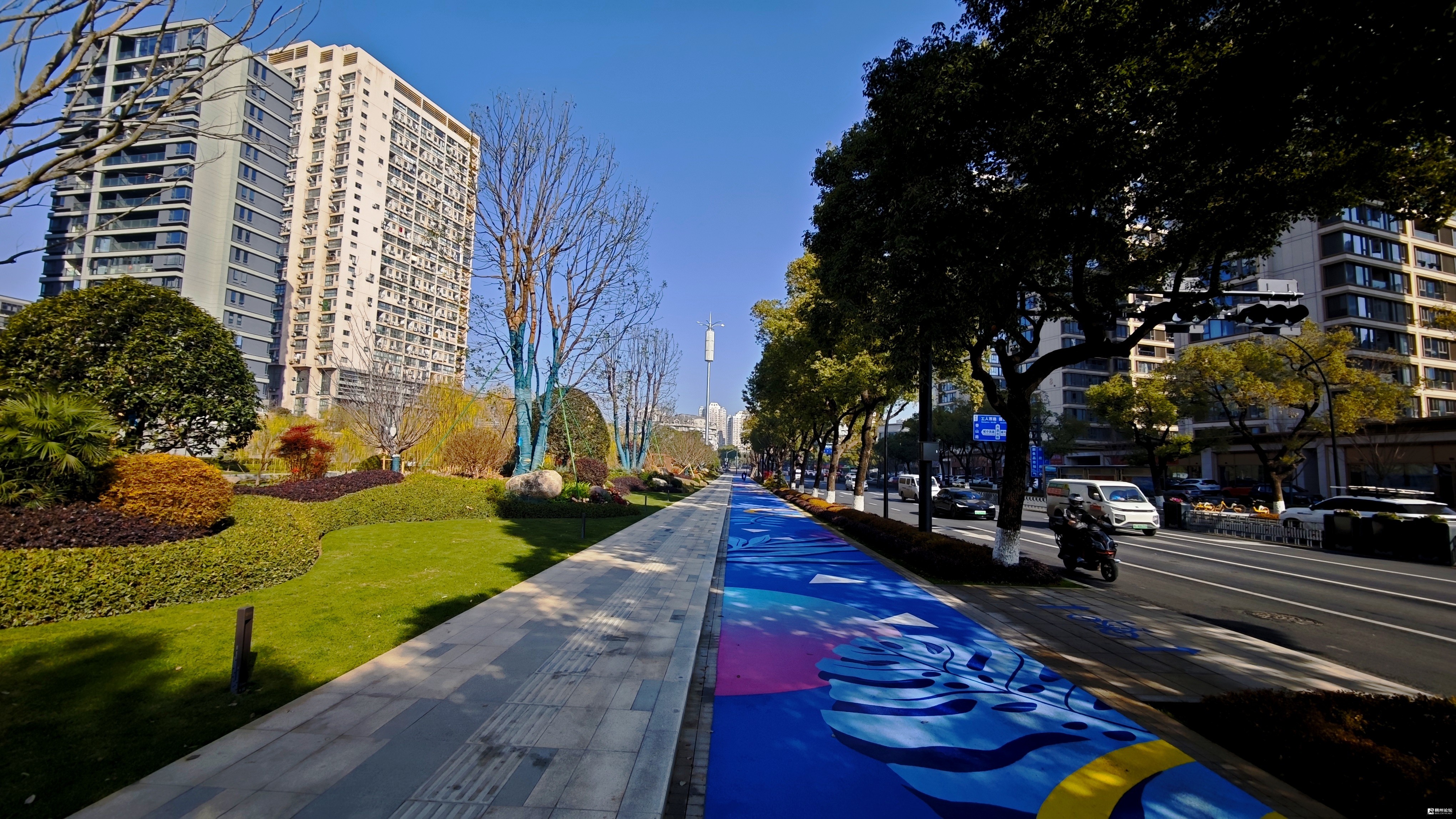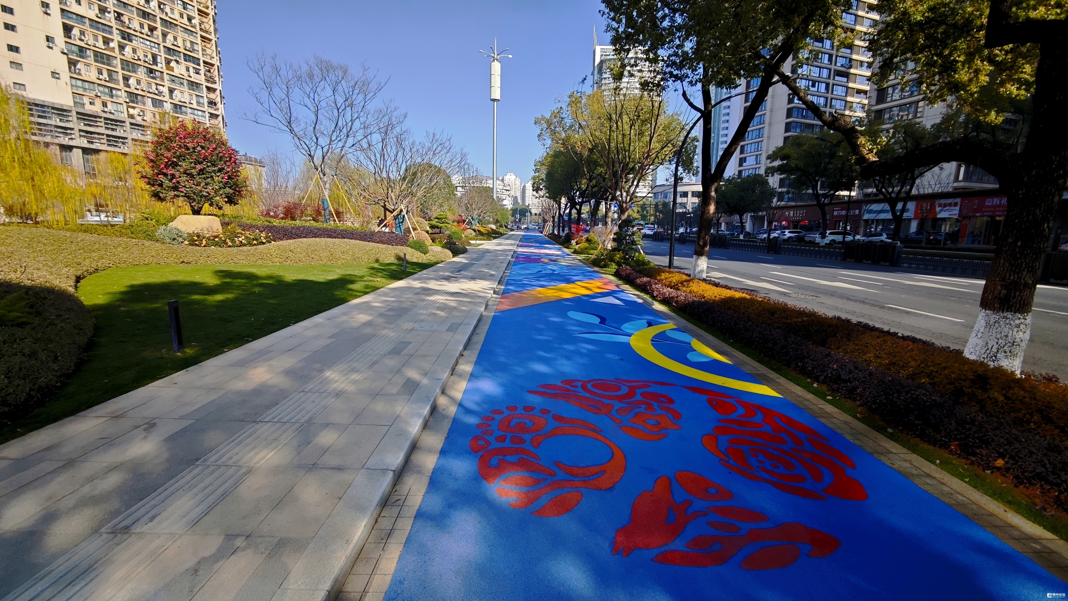 丹溪路:雨水管网提升改造工程已完工,慢行通道全面投入使用,设计上以“蓝色飘带”为视觉符号,结合植物绿化、花岗岩铺装及特色文化小品,营造出安全、舒适且富有文化韵味的步行空间。