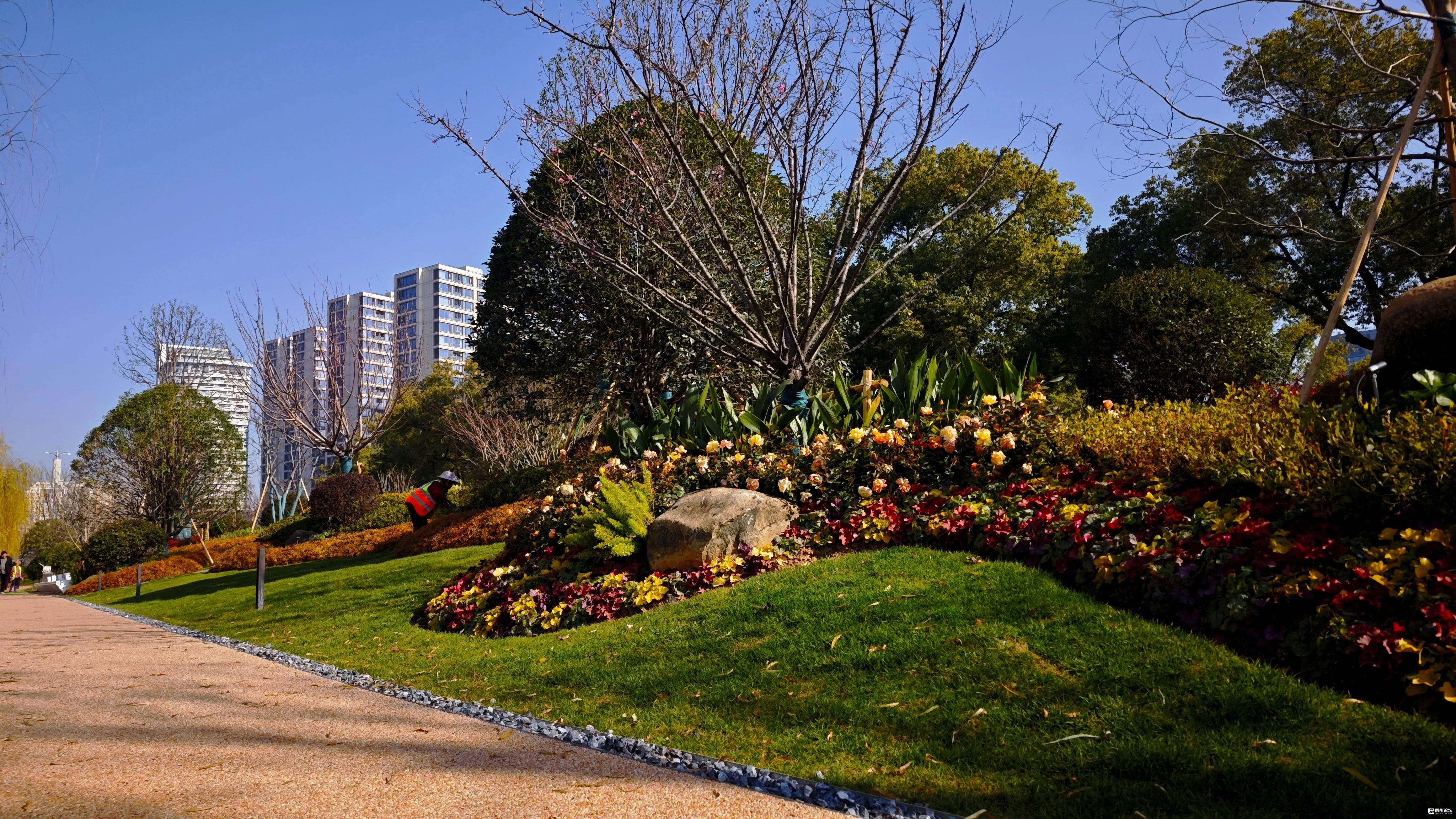 在众多形态各异的绿化小品中,我们可以看到园艺工作者的匠心打造。以蓝色为基调的骑行道和休憩空间,结合了“有情有义,世界义乌”的“六义”元素和多彩图形,既美观大方,又寓意深远。