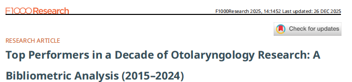 近日,国际权威学术平台F1000旗下期刊《F1000Research》发布了一份重量级的文献计量分析报告《Top Performers in a Decade of Otolaryngology Research: A Bibliometric Analysis (2015–2024)》(《2015-2024年十年耳鼻喉科研究的佼佼者》)。报告对过去十年全球耳鼻喉科学者的学术贡献进行了系统性分析,旨在识别该领域的领军力量。