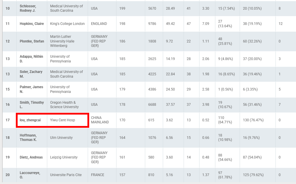在最终公布的全球前25位顶尖科学家中,义乌市中心医院耳鼻喉科主任、二级主任医师楼正才教授赫然在列,位列第17位。值得注意的是,榜单上的学者大多来自美国、德国、比利时、法国等实力雄厚的科研机构,义乌市中心医院是国内唯一入选的医疗机构,楼正才主任是入选的唯一一位中国学者,其含金量与象征意义不言而喻。