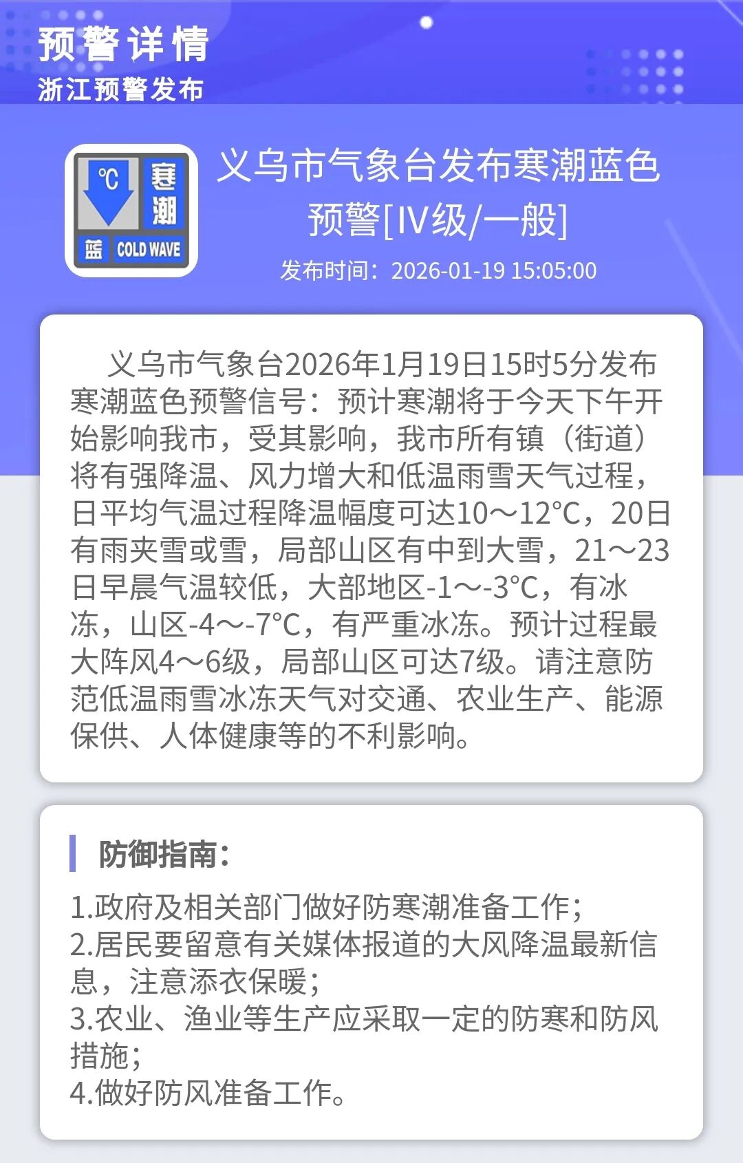 预计未来七天总体两头雨(雪)中间晴,气温起伏大。寒潮将于今天中午起影响义乌,受其影响,义乌将有次明显降温、大风和雨雪天气过程。预计日平均气温过程降温幅度可达10~12℃,21-23日早晨气温较低,大部-1~-3℃,有冰冻,山区-4~-7℃,有严重冰冻;预计过程最大阵风4~6级、高海拔山区可达7~8级。
