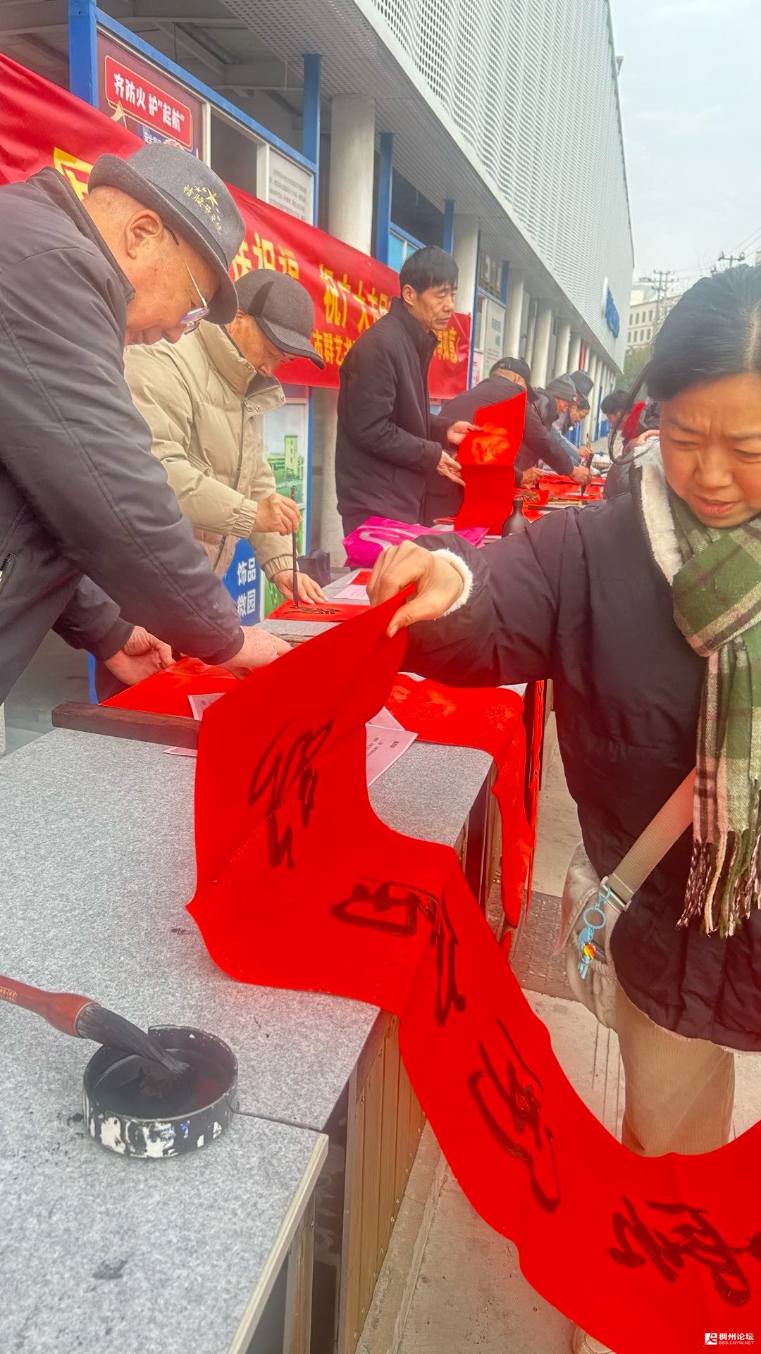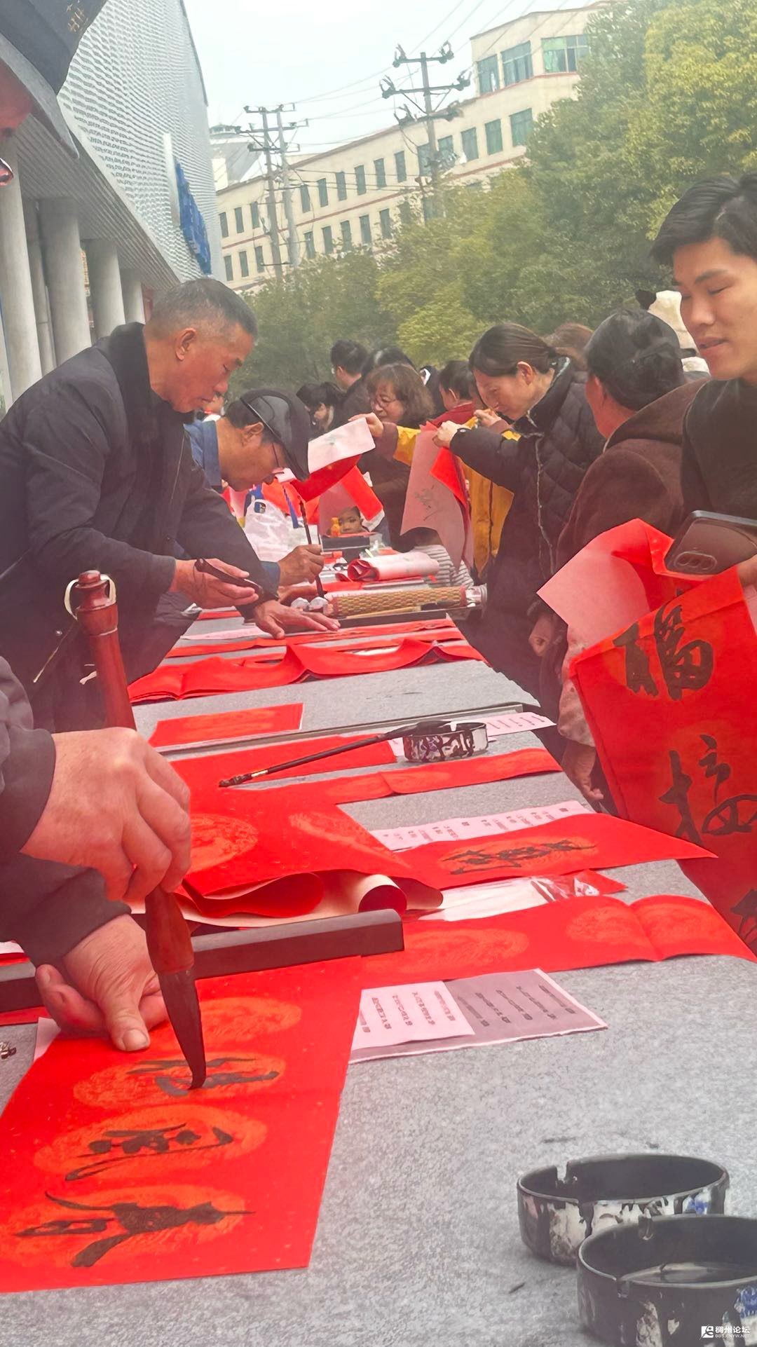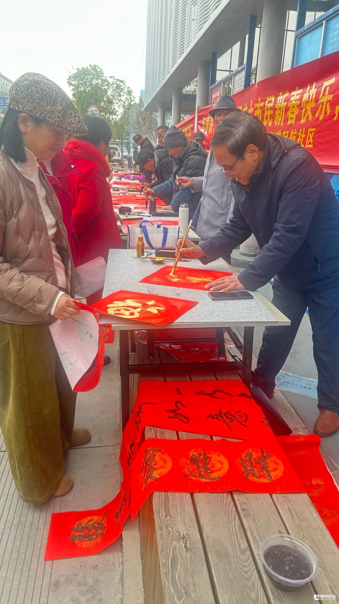 新春将至,后宅街道起航社区暖意融融,一条鲜红的横幅高高挂起,“写春联送祝福,祝广大市民新春快乐”的字样格外醒目,传递着浓浓的年味与真挚的祝福。群艺书画社的会员们,在叶老师和毛老师的组织带领下兵分两路,在起航社区的另一边也支起了摊位,摆好桌子与笔墨纸砚。会员们不时相互切磋技艺,笔墨飞舞间,一副副对仗工整、寓意吉祥的春联接连呈现。浓浓的墨香裹挟着新春的祝福,温暖着每一位驻足的市民,让活动现场更显温馨热闹。摊位前很快就聚集了不少人,大家蜂拥而至,有人好奇地问:“多少钱一幅对联啊?”会员们笑着回应:“不要钱,免费送!”还有些人一脸惊讶,不敢相信这是真的,脸上满是意外与欣喜。