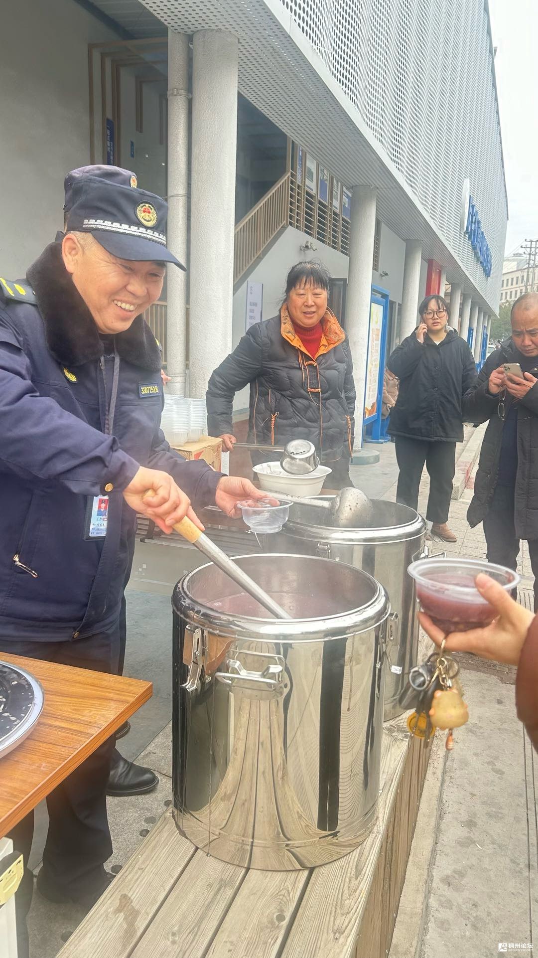 起航社区里,腊八粥派送活动正热闹开展,香甜的气息在空气中弥漫。热心的市民们端着一碗碗热气腾腾的腊八粥,径直走向群艺书画社的摊位。“天冷,快趁热喝点暖暖身子!”他们笑着把粥递过来,碗里的糯米、红豆、莲子在热气中微微晃动,暖意顺着指尖传到心间。墨香与粥香交织在一起,书画社的会员们接过这带着温度的馈赠,心里暖融融的,笔下的春联仿佛也因此更添了几分温情,整个社区都浸在这份双向奔赴的善意与暖意里。